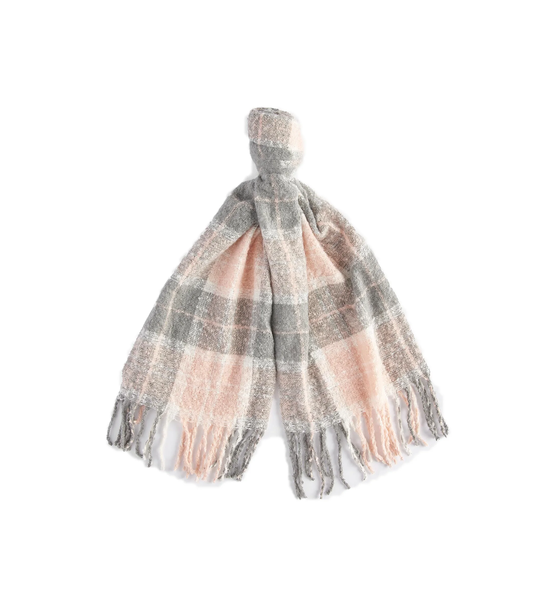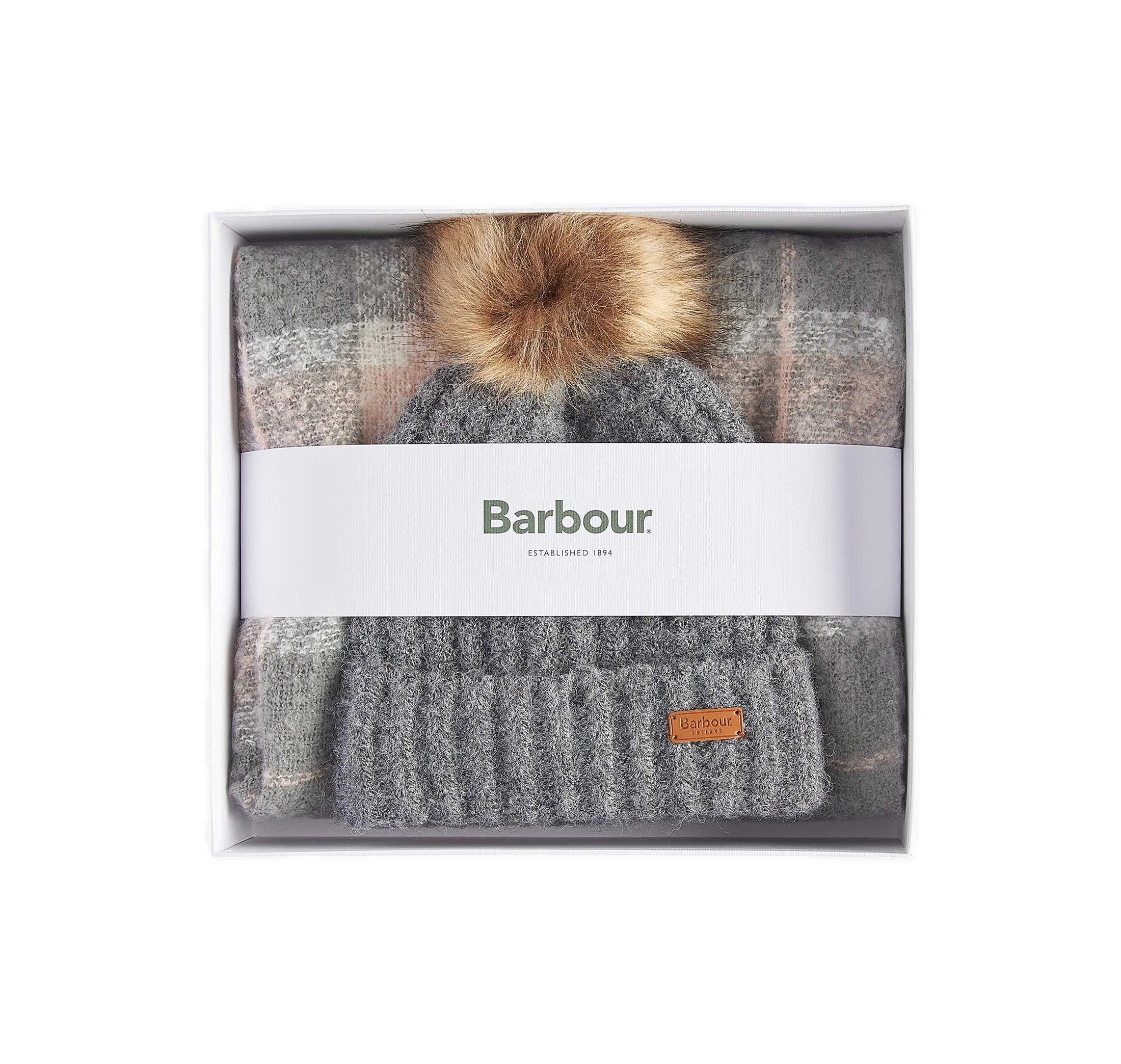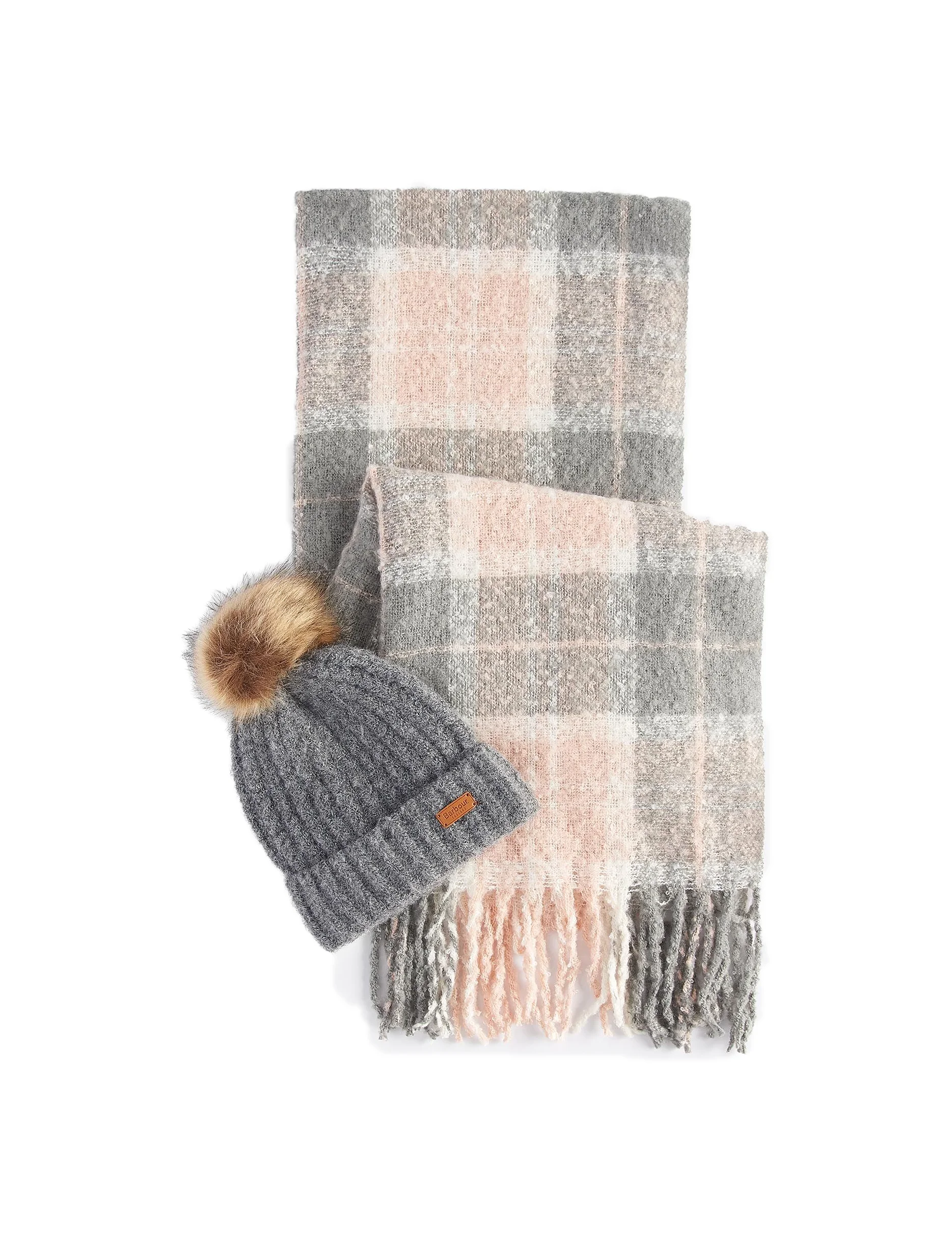 BARBOUR SALT BURN BEANIE AND TARTAN SCARF GREY ROSE GIFT SET