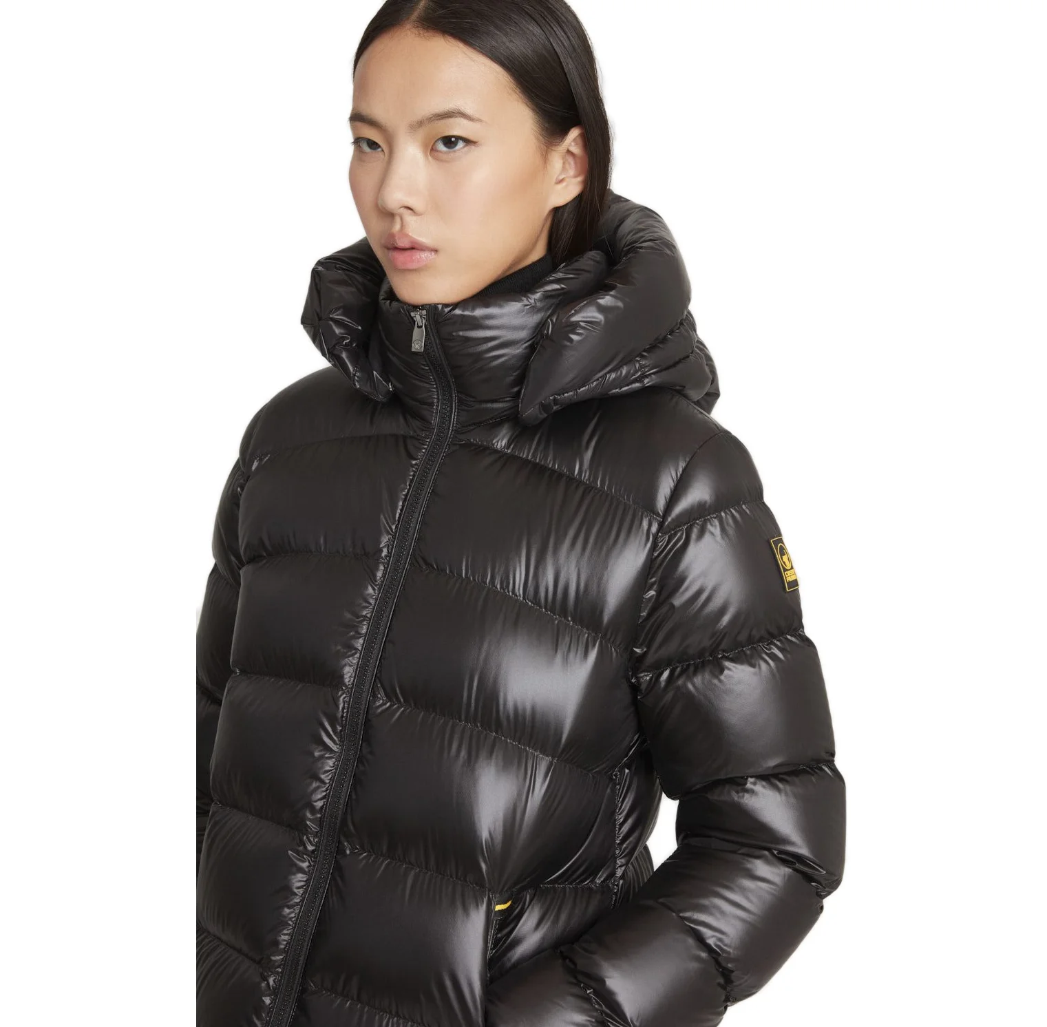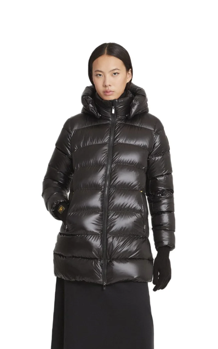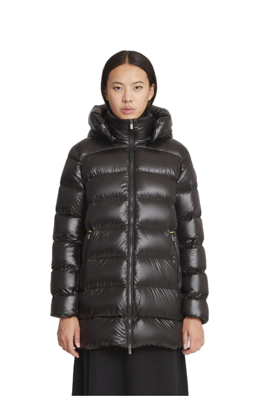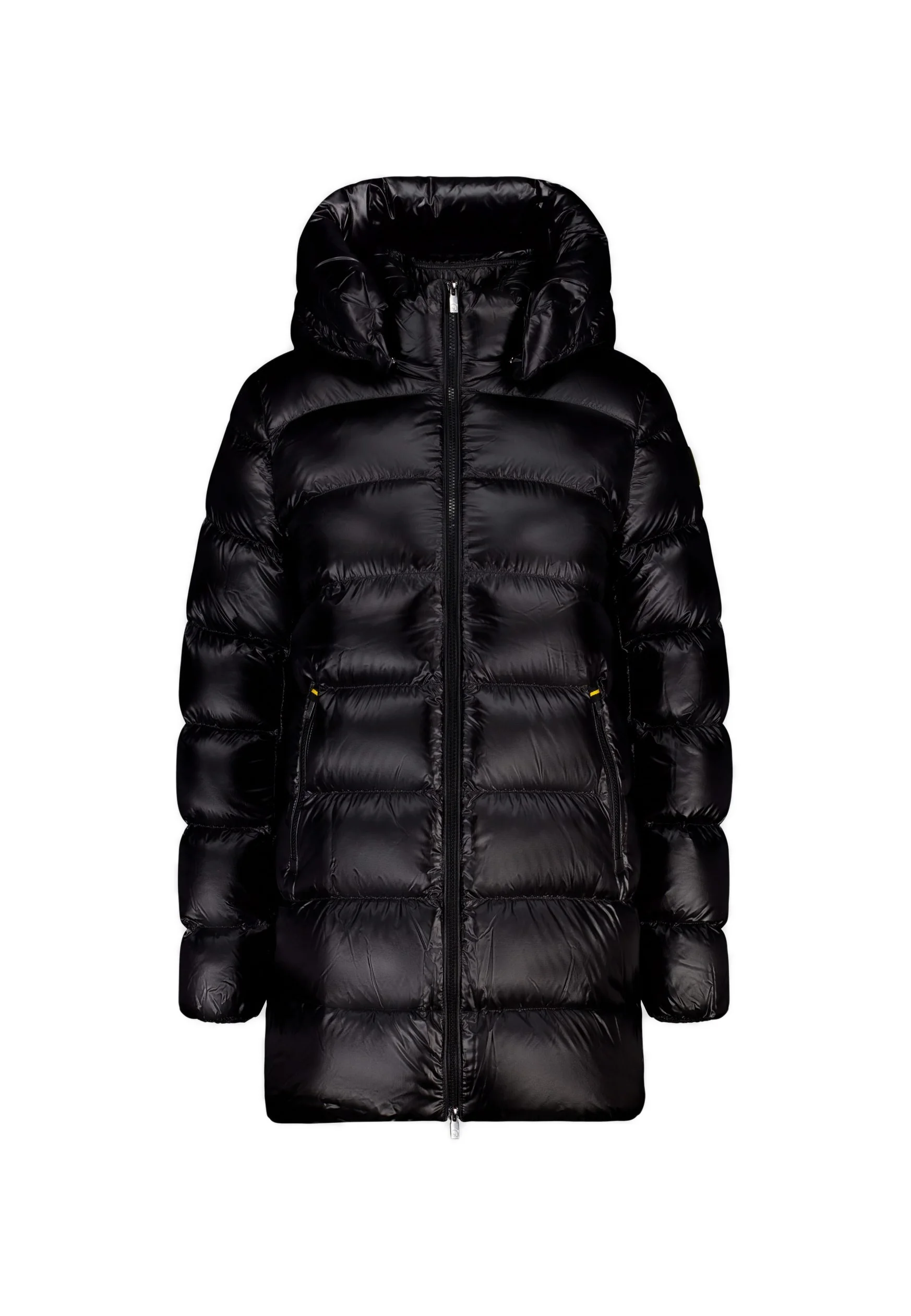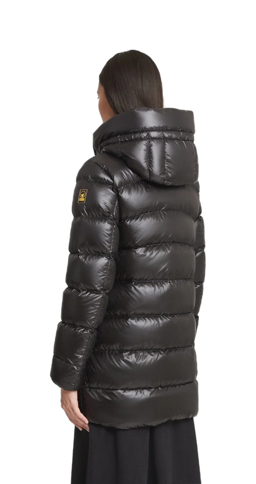 Piumino medio-lungo nero 200 grammi da donna con cappuccio staccabile, realizzato in tessuto microripstop lucido a trama nera e imbottito con vera piuma certificata 800 fill power, che assicura elevate performance termiche e leggerezza assoluta.