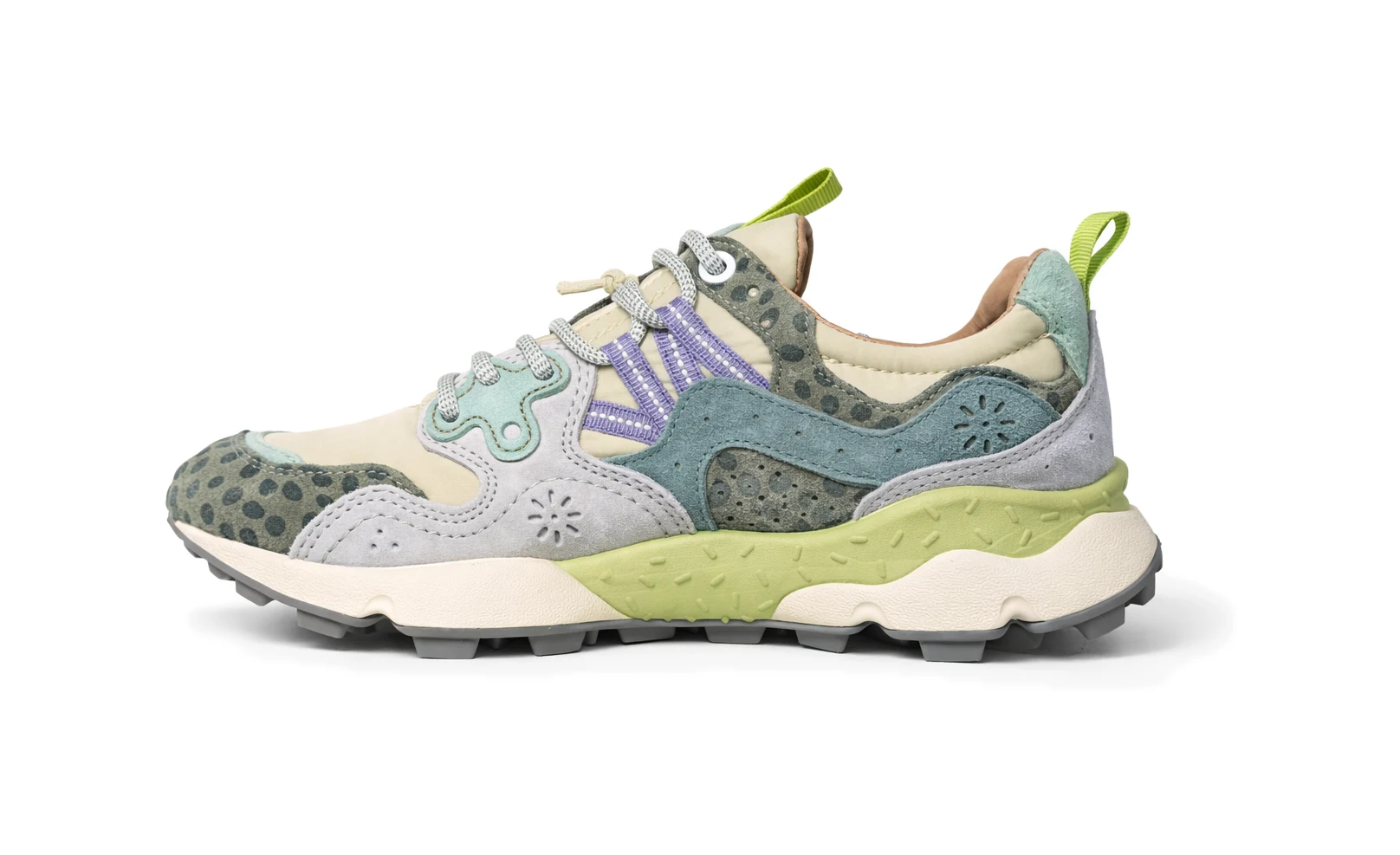 Sportiva nelle forme, la sneaker Yamano 3 è la scelta più cool anche per i look metropolitani: la tomaia in tessuto tecnico con inserti in suede presenta le traforature iconiche e un'allacciatura con occhielli rinforzati e string trekking, ispirati ai modelli performance. Comfort e benessere sono assicurati dalla soletta interna in sughero anatomica e antibatterica, e dal fondo in gomma ultra leggera con sagomature laterali e battistrada dentellato.