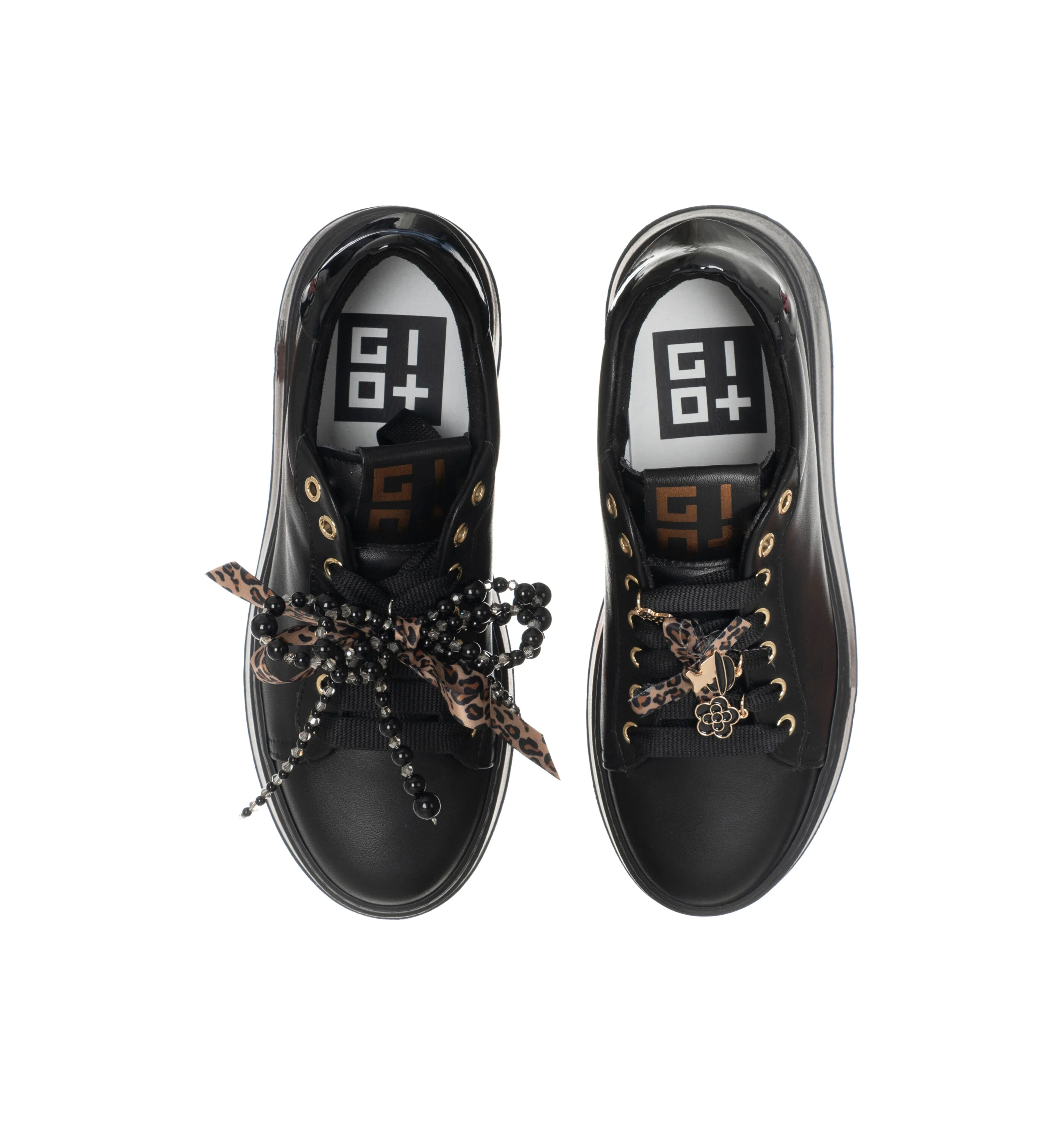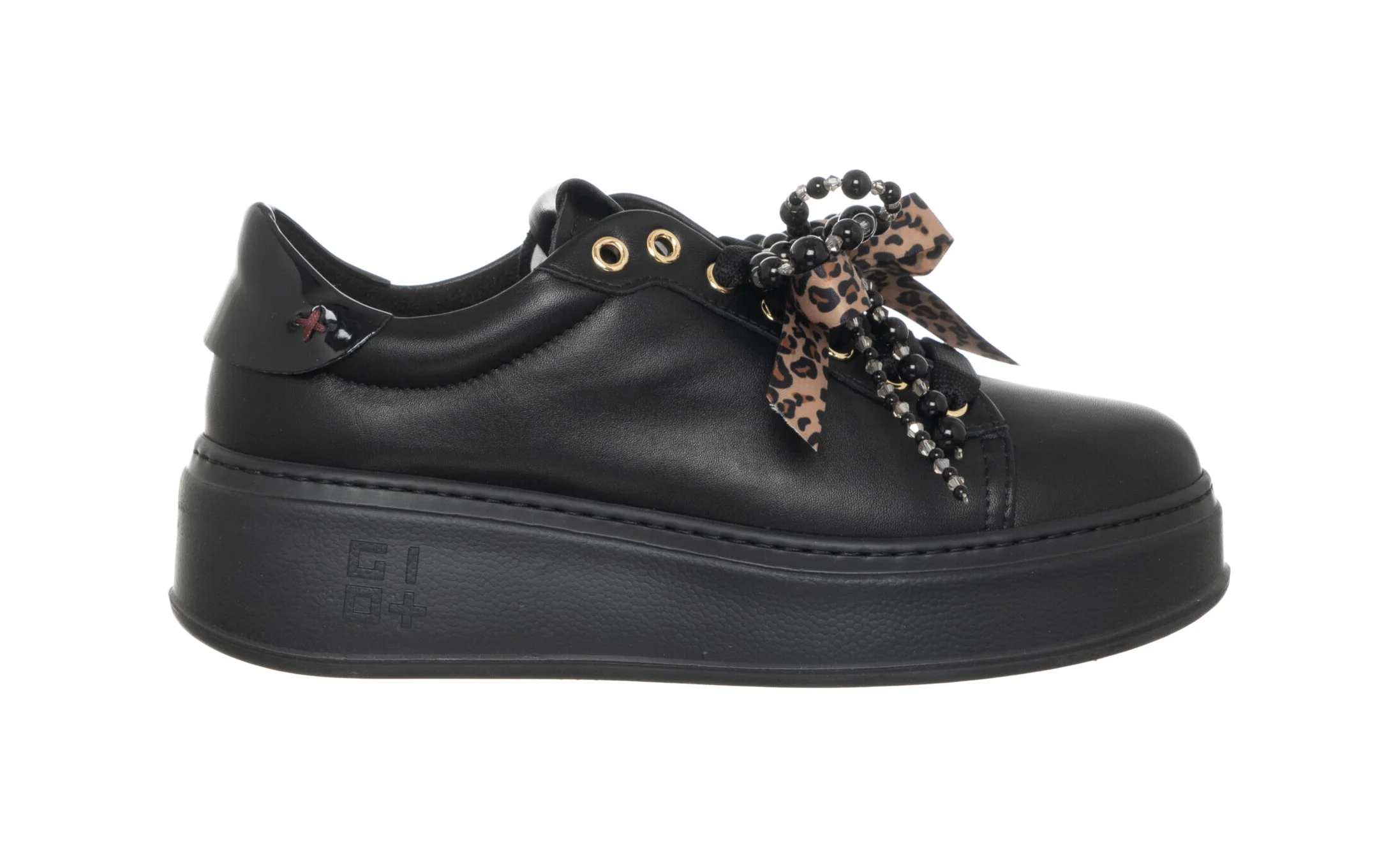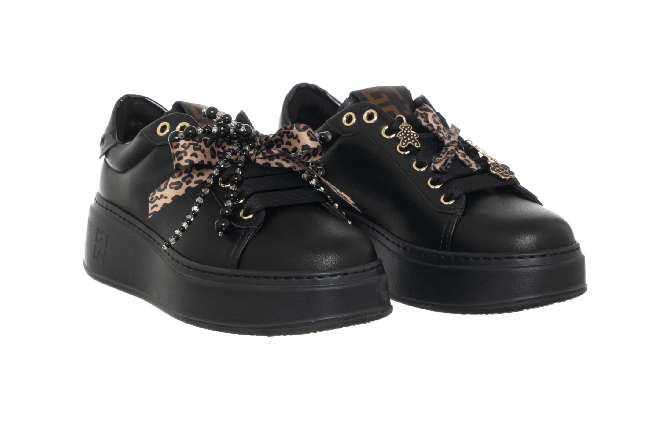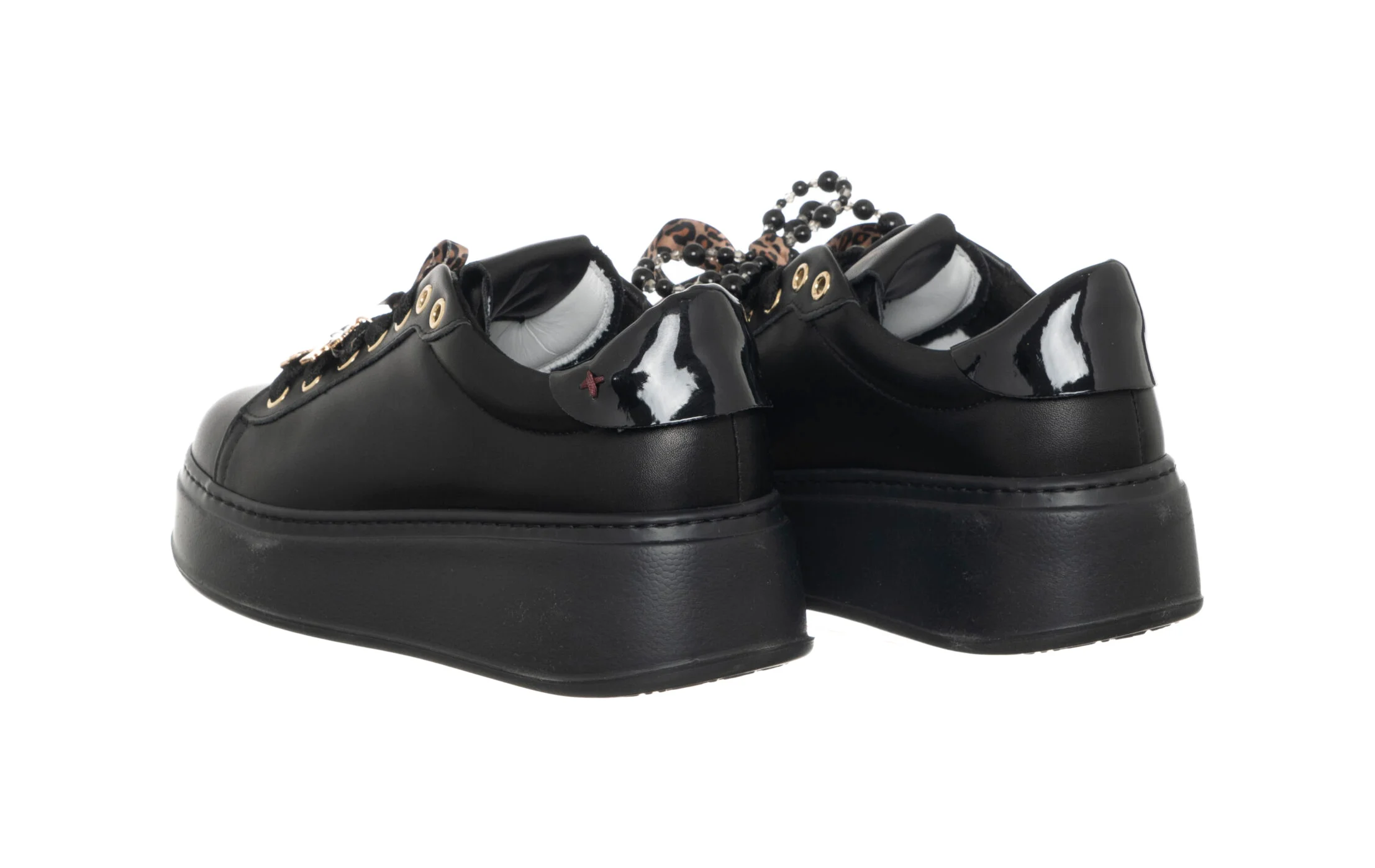 In pelle di vitello di colore nero con talloncino in tono su tono. Caratterizzata da occhielli in metallo oro, targhetta sulla linguetta con il logo in laminato oro e sono applicati accessori passalaccio a forma di fiocchi e perle, lacci piatti in cotone.