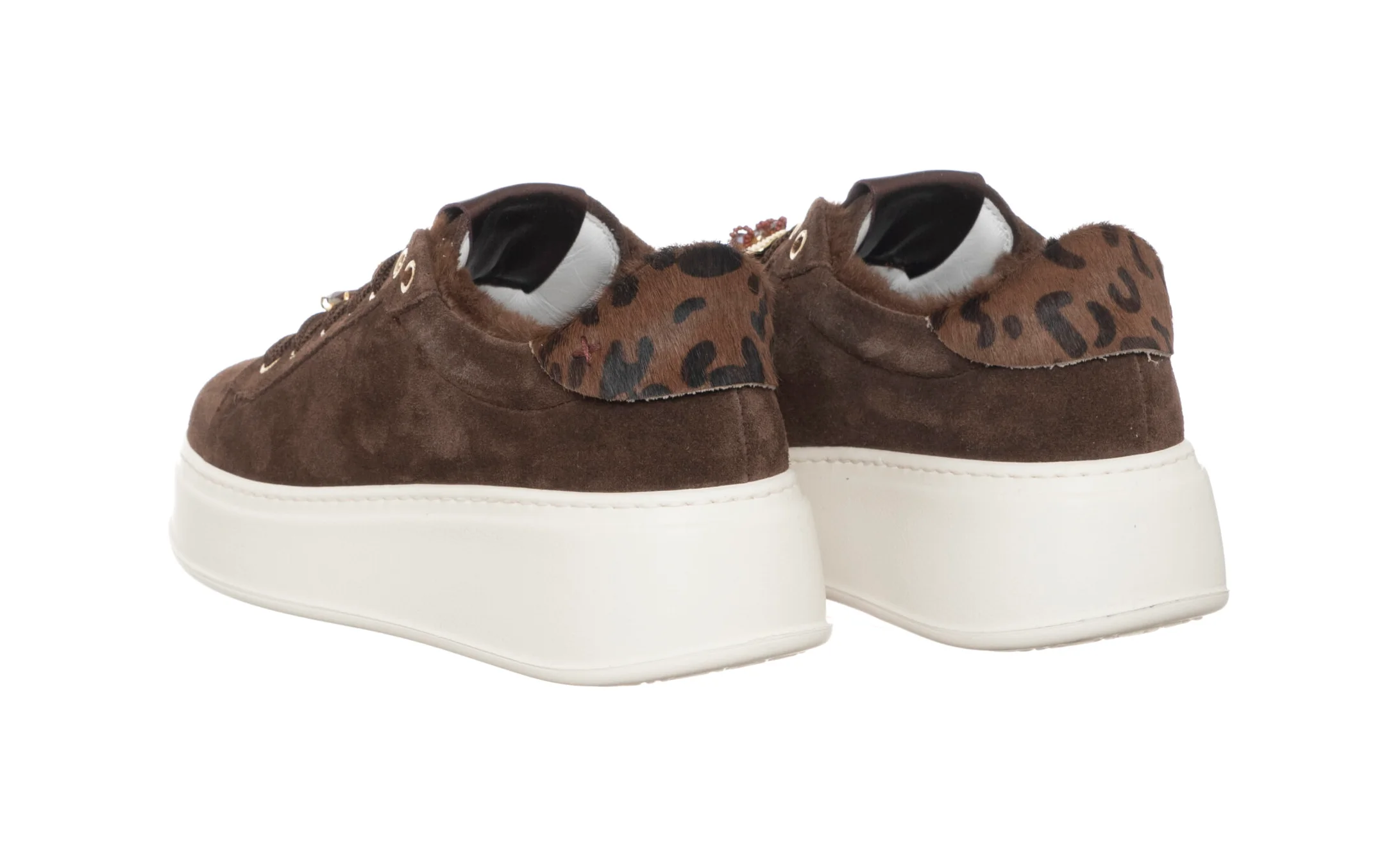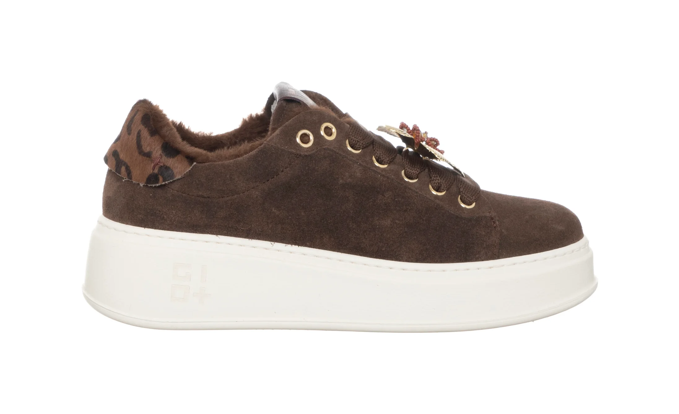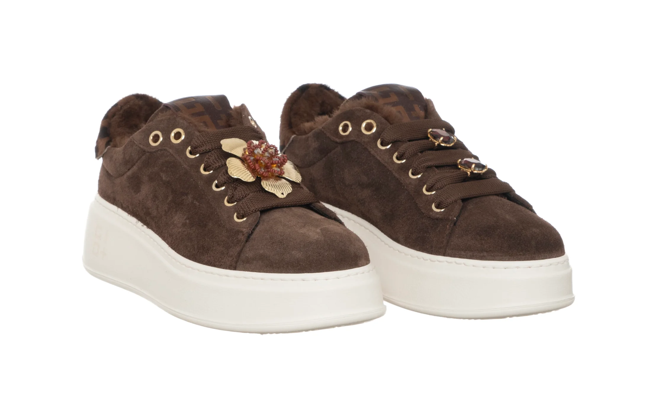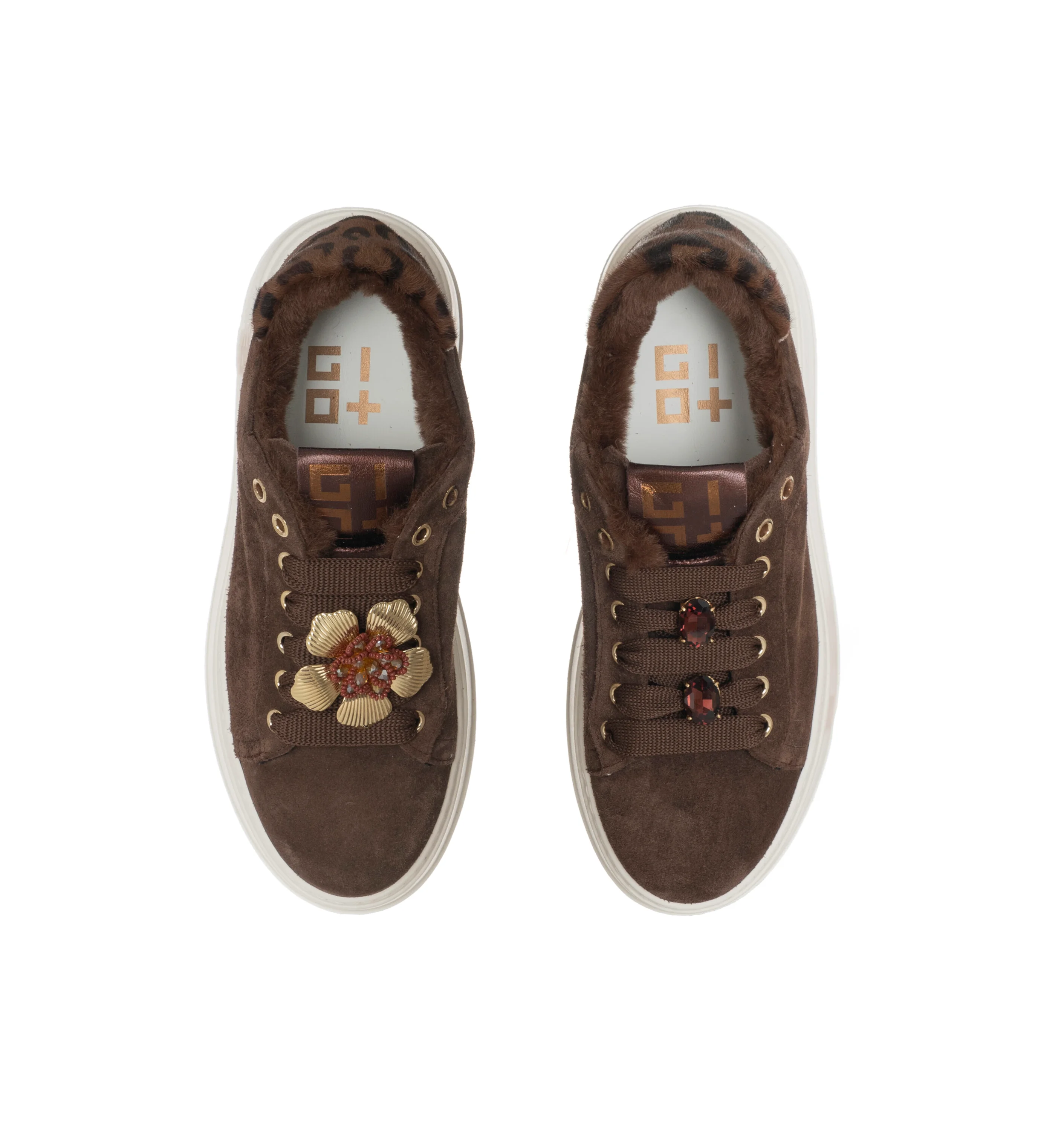 In camoscio di colore marrone . Caratterizzata da occhielli in metallo oro, targhetta sulla linguetta con il logo in laminato oro e sono applicati accessori passalaccio a forma di fiore e castoni, lacci piatti in cotone.