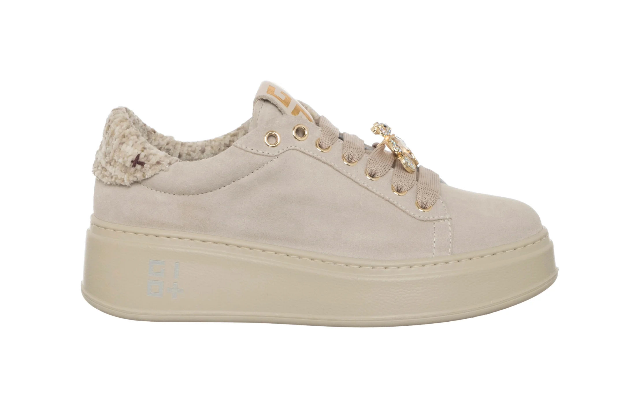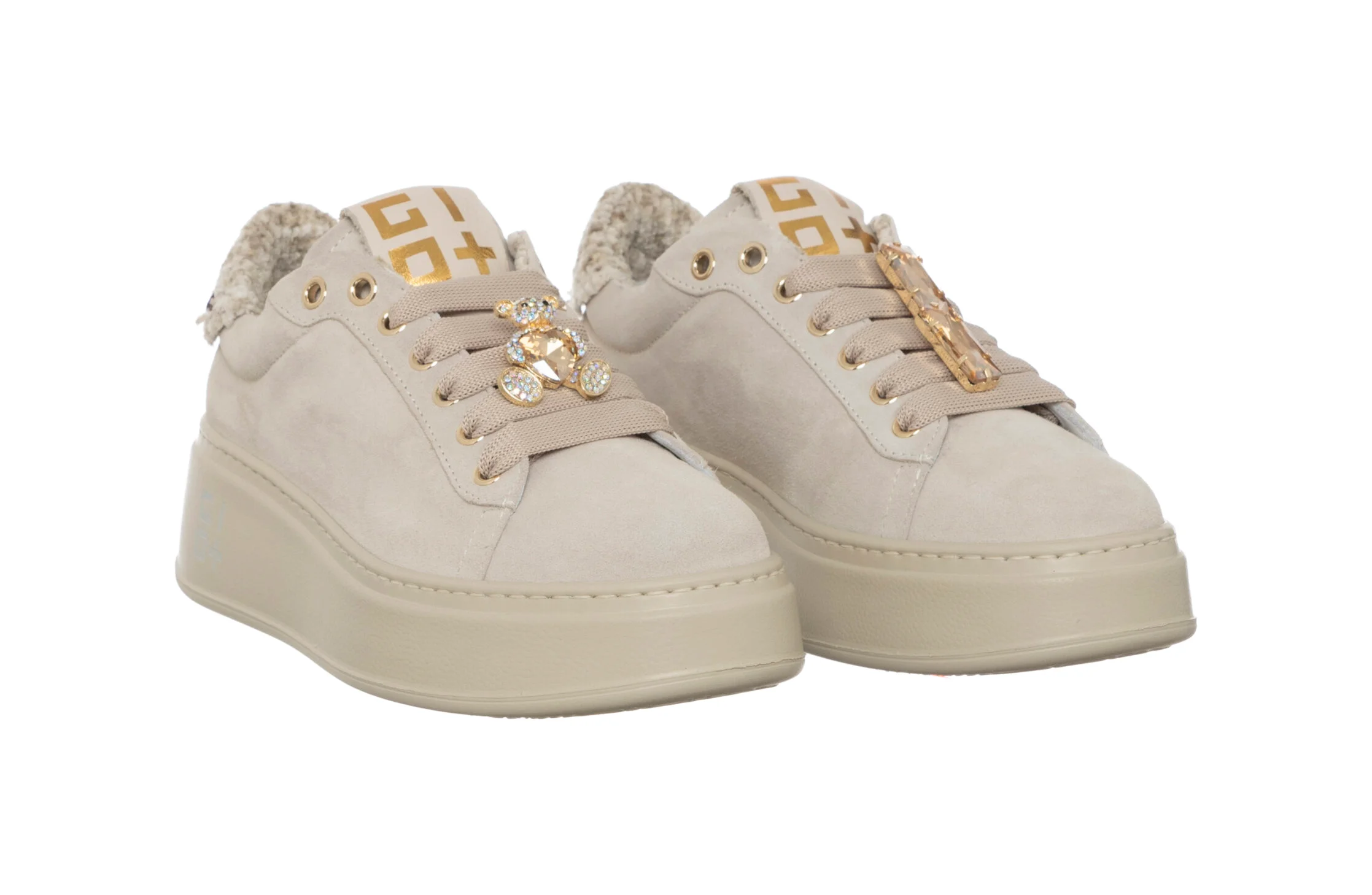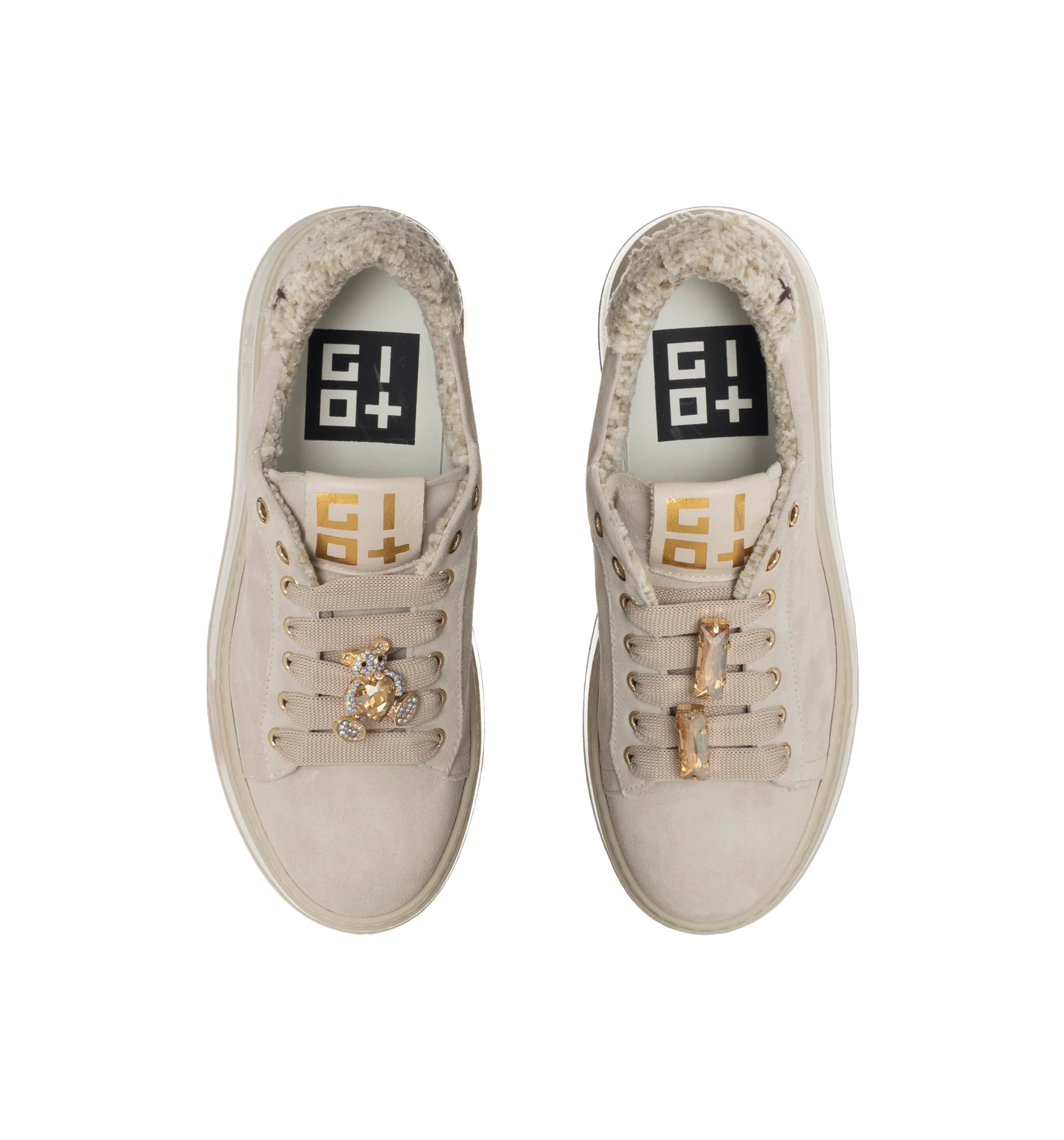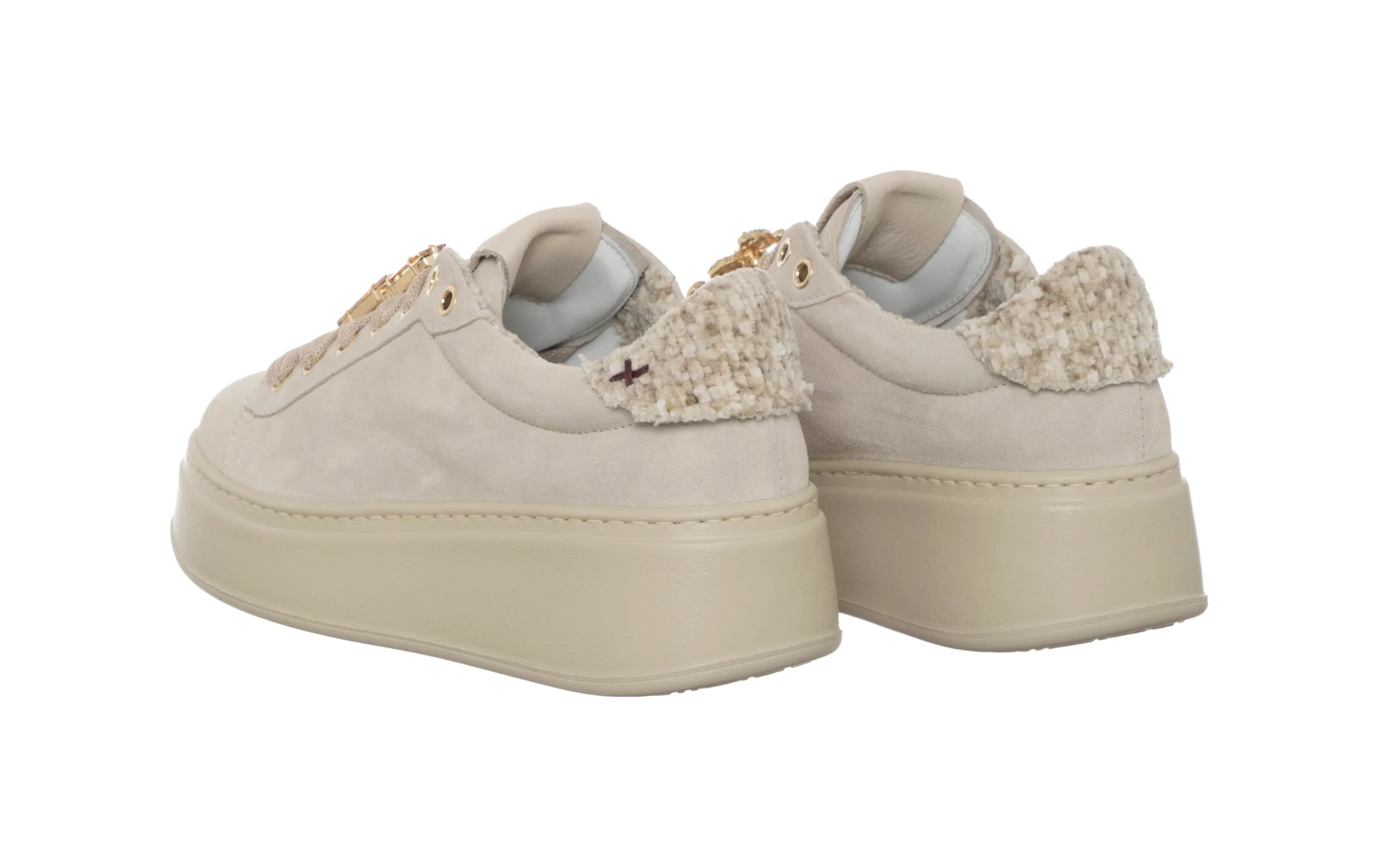 In camoscio di colore beige con talloncino in teddy. Caratterizzata da occhielli in metallo oro, targhetta sulla linguetta con il logo in laminato oro e sono applicati accessori passalaccio a forma di orsetto e castoni, lacci piatti in cotone.