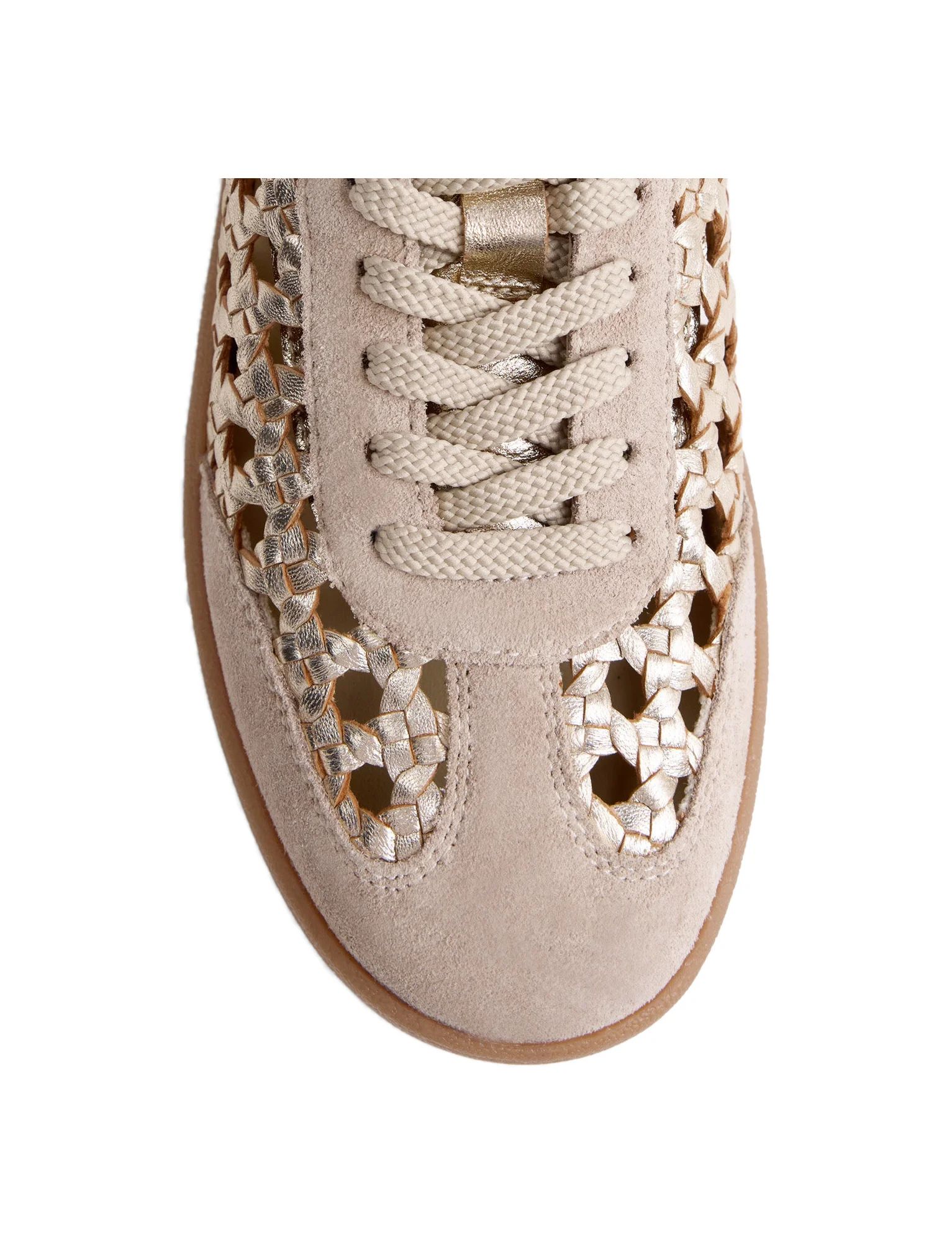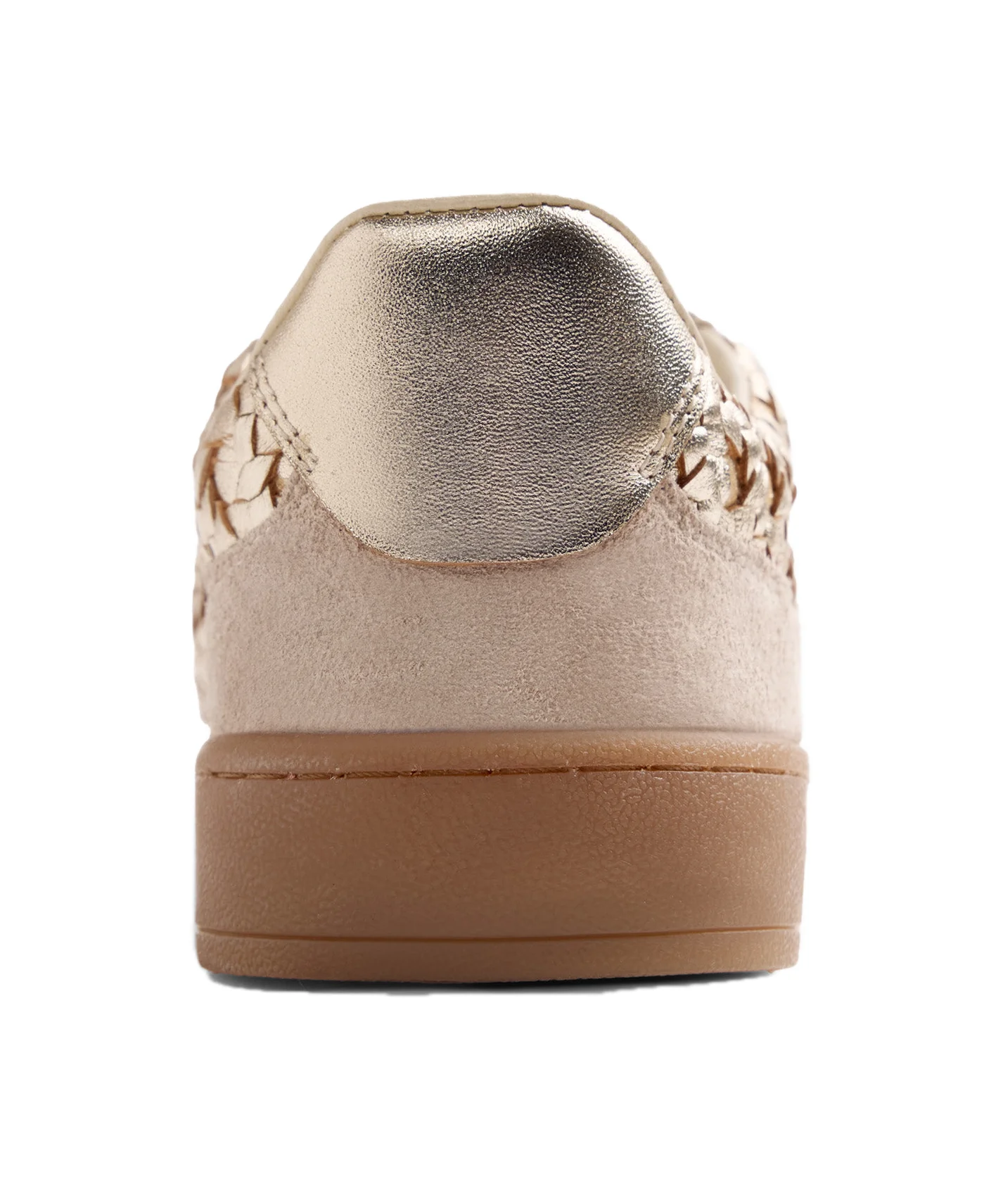 Sneakers in pelle intrecciata a mano con finitura metallizzata e inserti in suede. Presentano un sottopiede imbottito e termoformato per distribuire uniformemente il peso del corpo su tutta la pianta. Altezza plateau: 3 cm. Eventuali variazioni nella pelle o nella finitura tra un piede e l'altro riflettono l'autenticità del processo artigianale e l'utilizzo di pellami naturali. Tomaia e sottopiede in pelle. Fodera in pelle e morbido cotone. Suola in TPR.