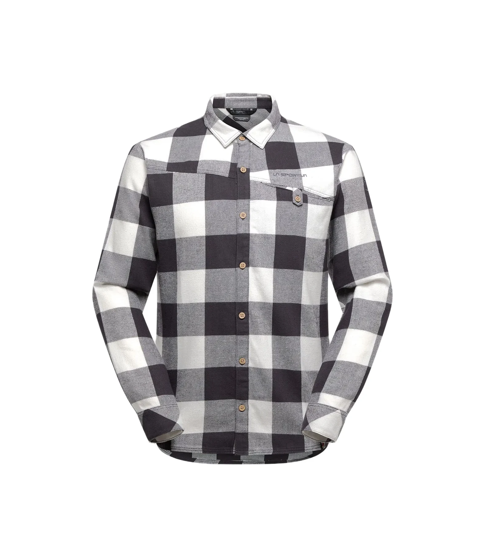 Una classica camicia di flanella in misto cotone e poliestere, con bottoni unici in noce di cocco.