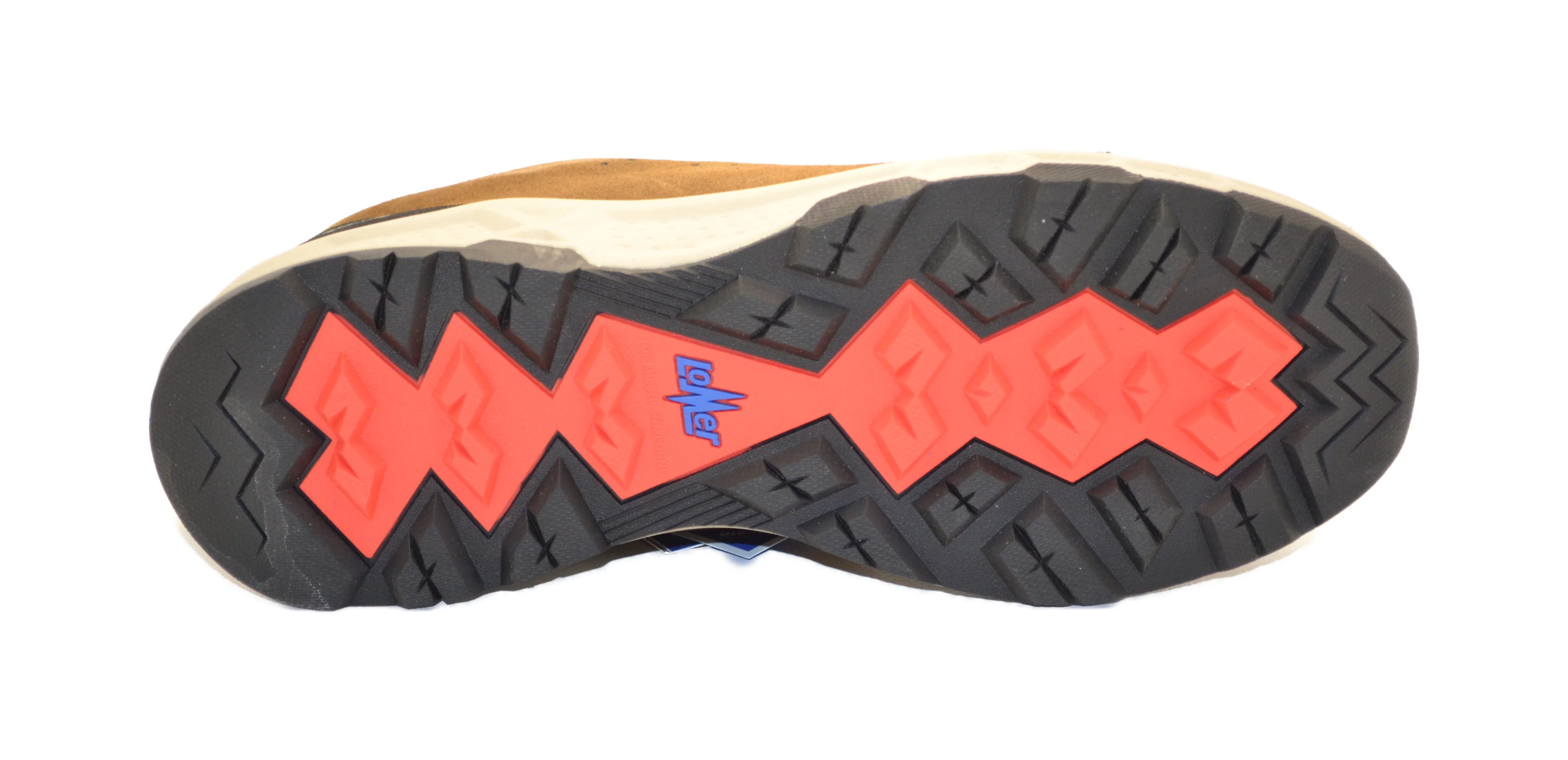 La suola Lomer è progettata per facilitare le fasi di rullata (appoggio e spinta) e combina una suola in gomma altamente resistente con un grip eccellente e un'intersuola in EVA leggera con un'eccellente ammortizzazione.