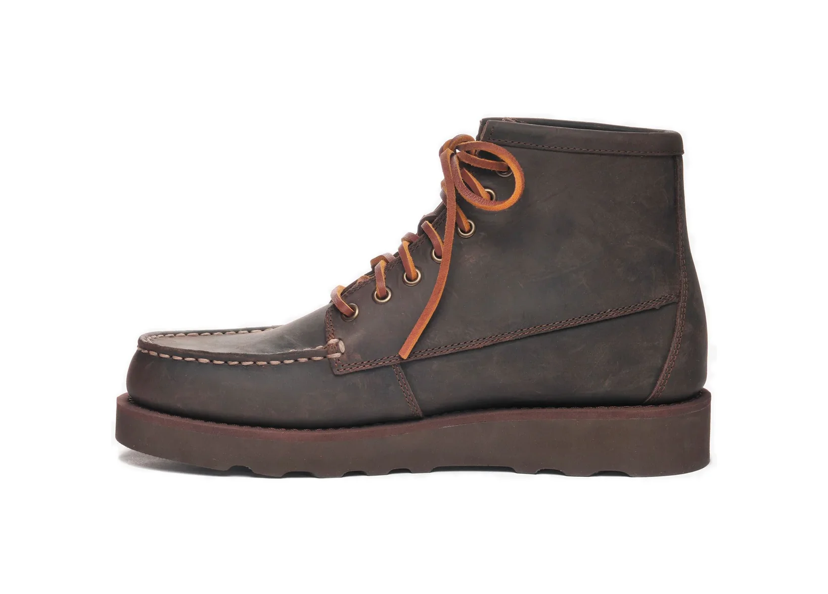 Progettato per vestire uno stile di scarponcino moc toe tradizionale con una ispirazione più contemporanea, questo robusto boot mid da vita all'aperto è stato creato in cuoio intensamente cerato “crazy Horse”, che acquisisce una straordinaria e duratura patina di vissuto con il passare del tempo.