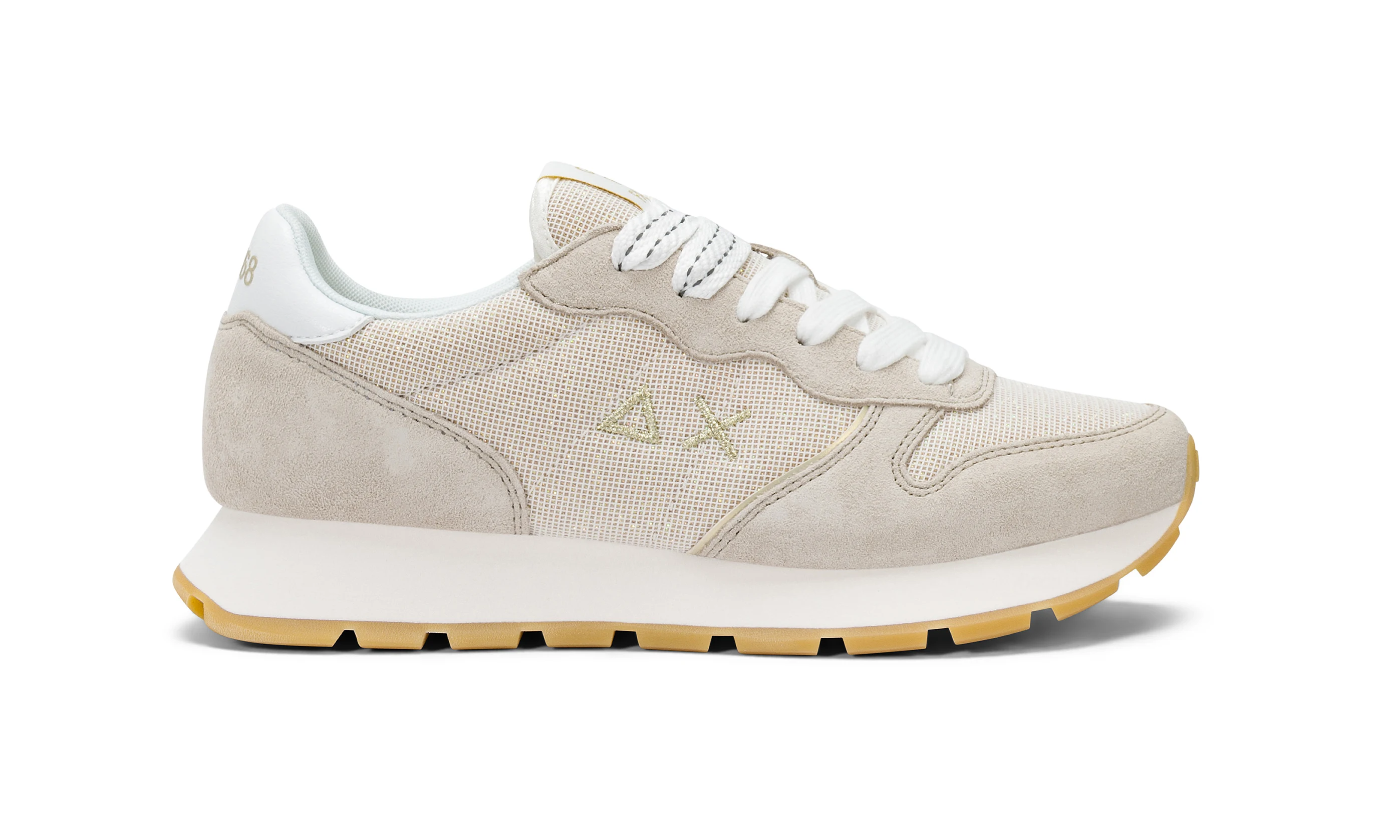 Design casual dall'estetica glamour. La sneaker Ally Glitter è l'icona SUN68 reinterpretata con una speciale tomaia in materiale glitterato, dettagli laminati e il logo ricamato in filo lurex.