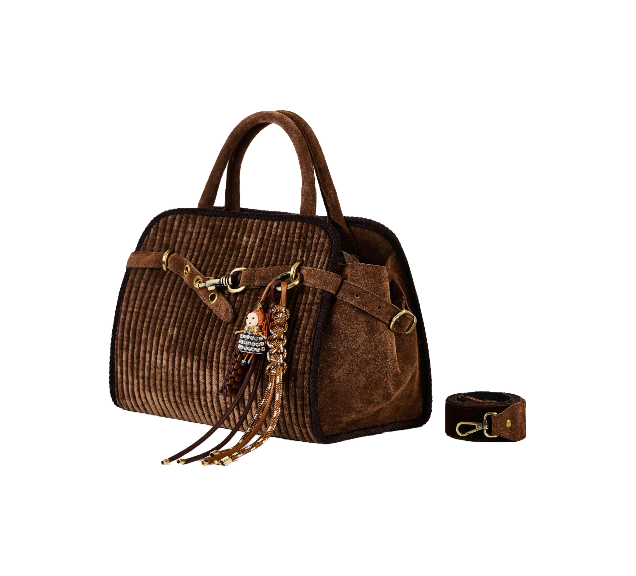 Borsa in velluto a coste con applicazione di charms, dettagli in camoscio, manico in camoscio, chiusura superiore con zip, tasca interna e tracolla in velluto.