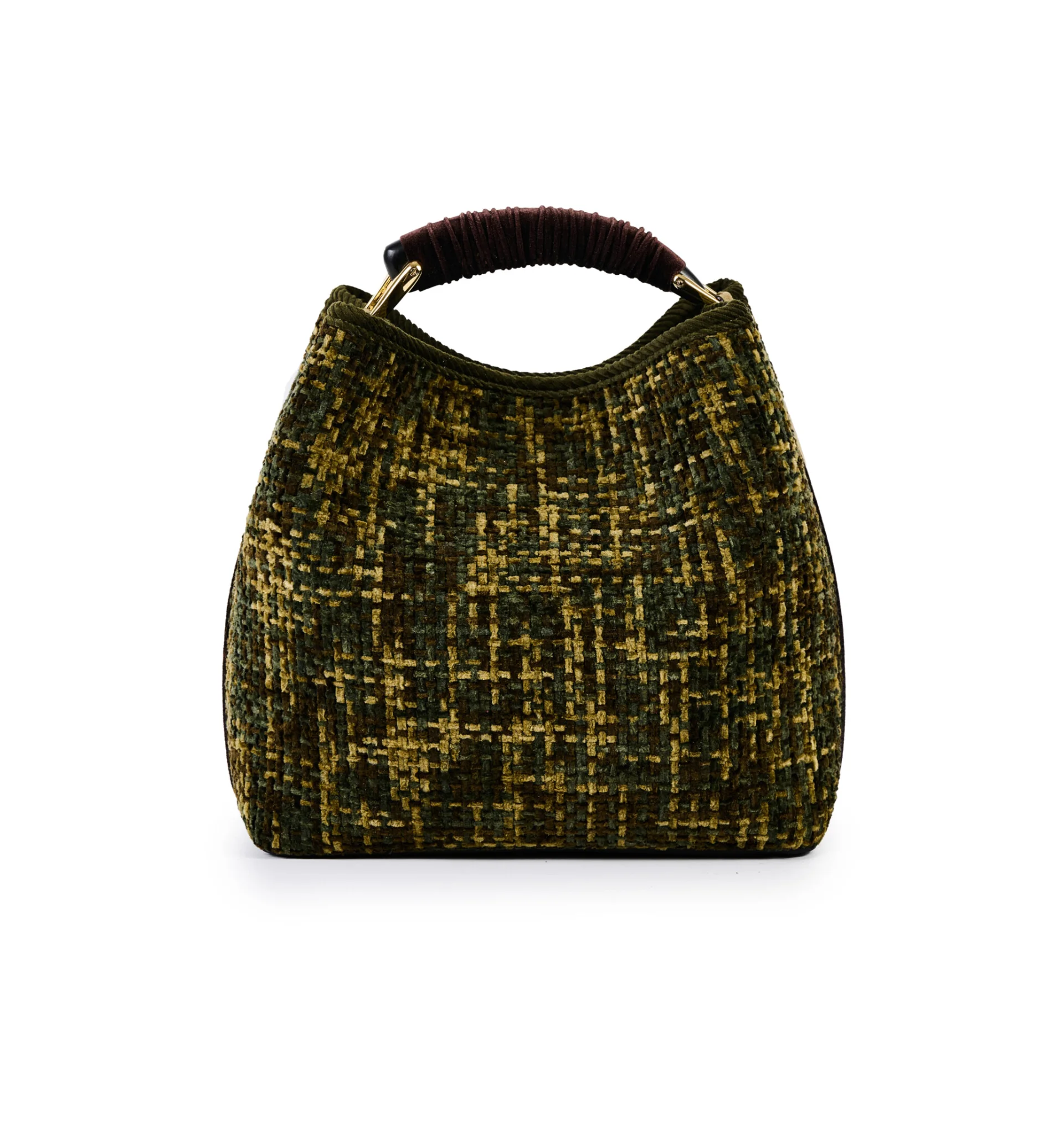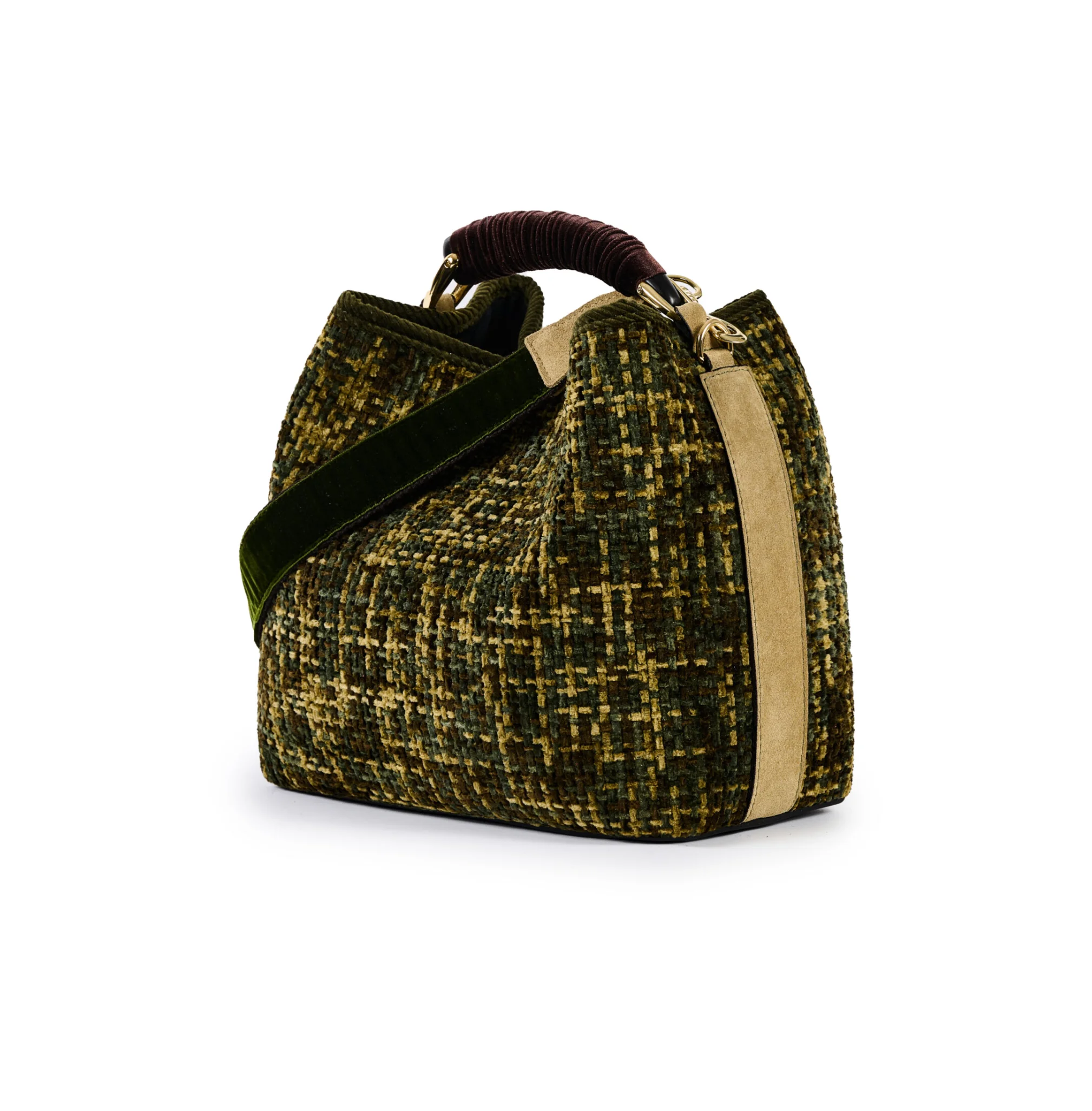 Secchiello in ciniglia jacquard e manico fasciato in velluto, richiudibile con calamita, tasca interna e tracolla in velluto con dettagli in pelle.
