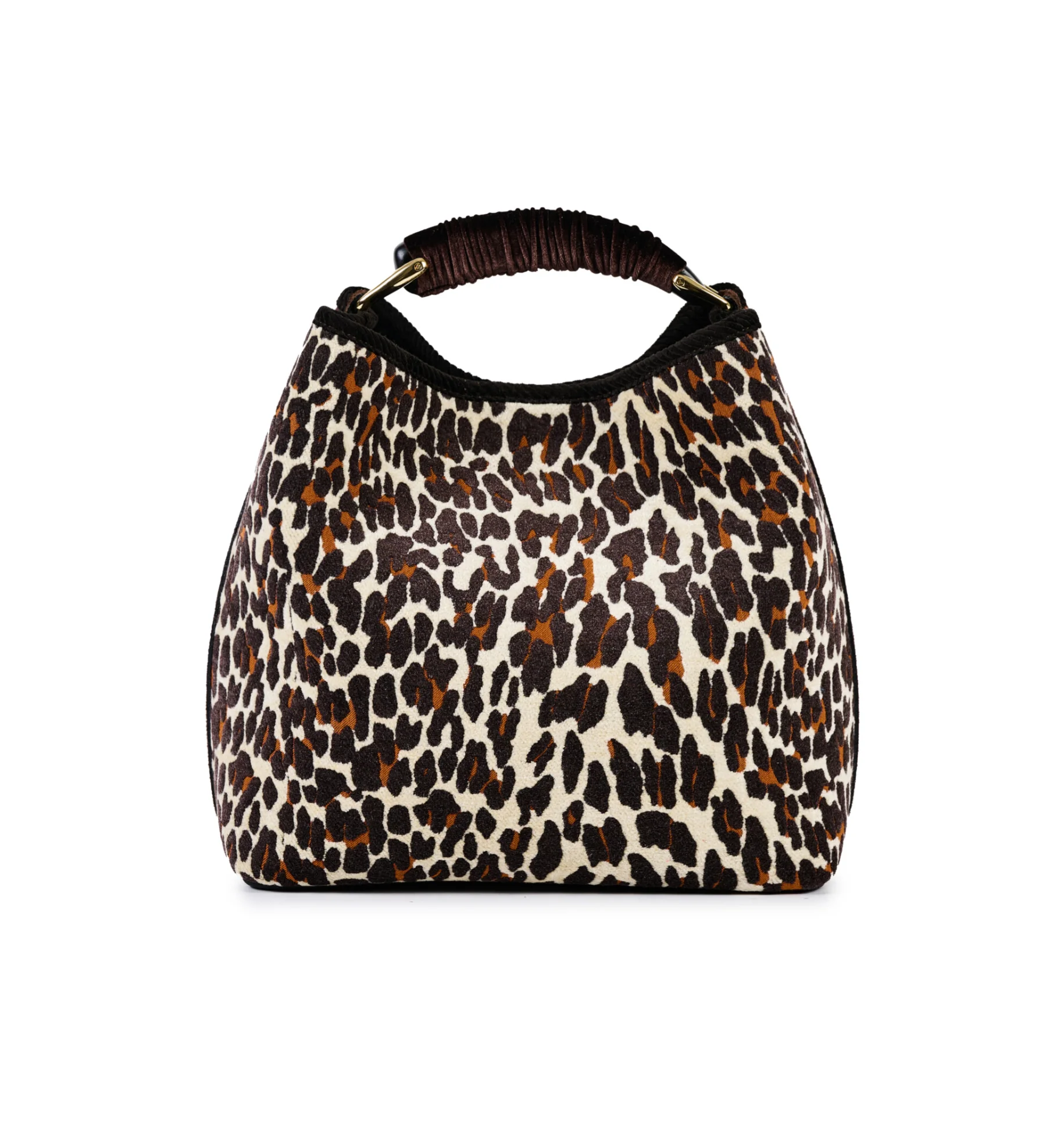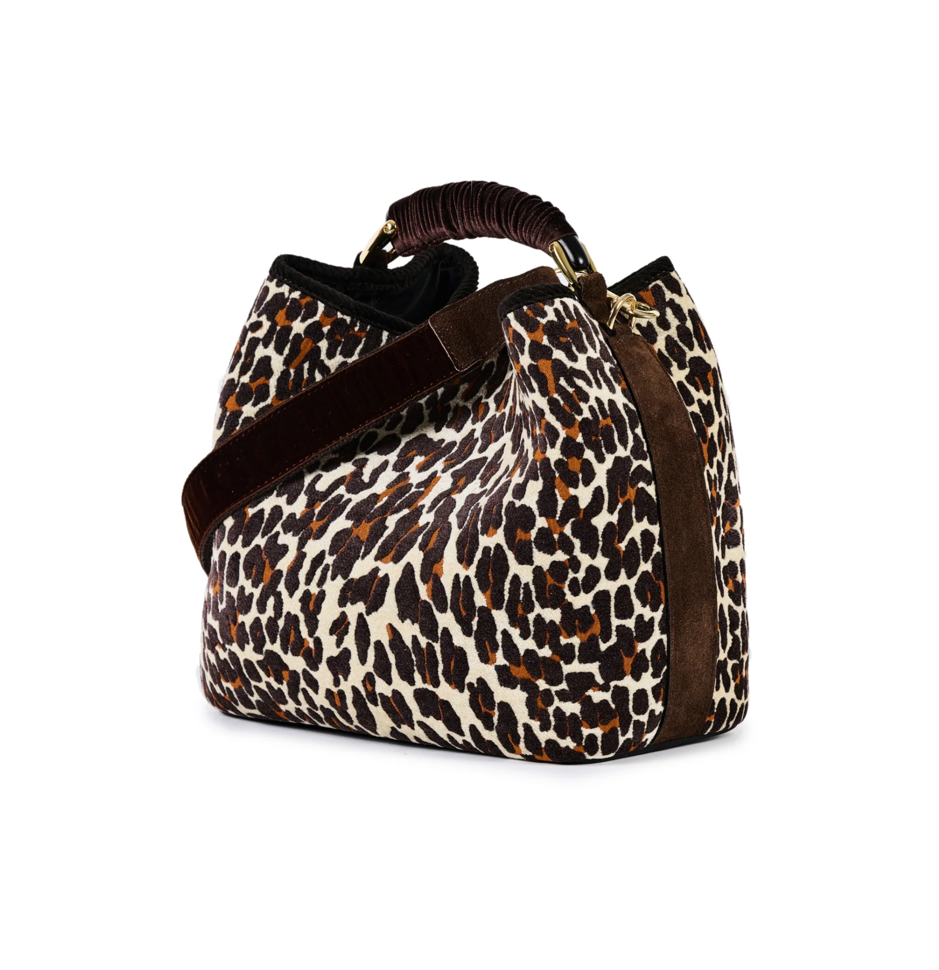 Secchiello in ciniglia jacquard e manico fasciato in velluto, richiudibile con calamita, tasca interna e tracolla in velluto con dettagli in camoscio.