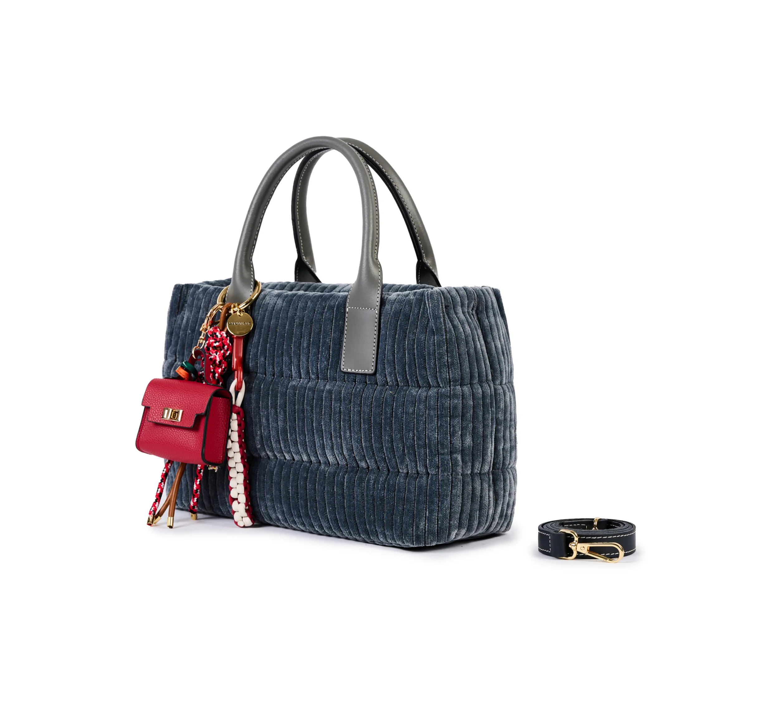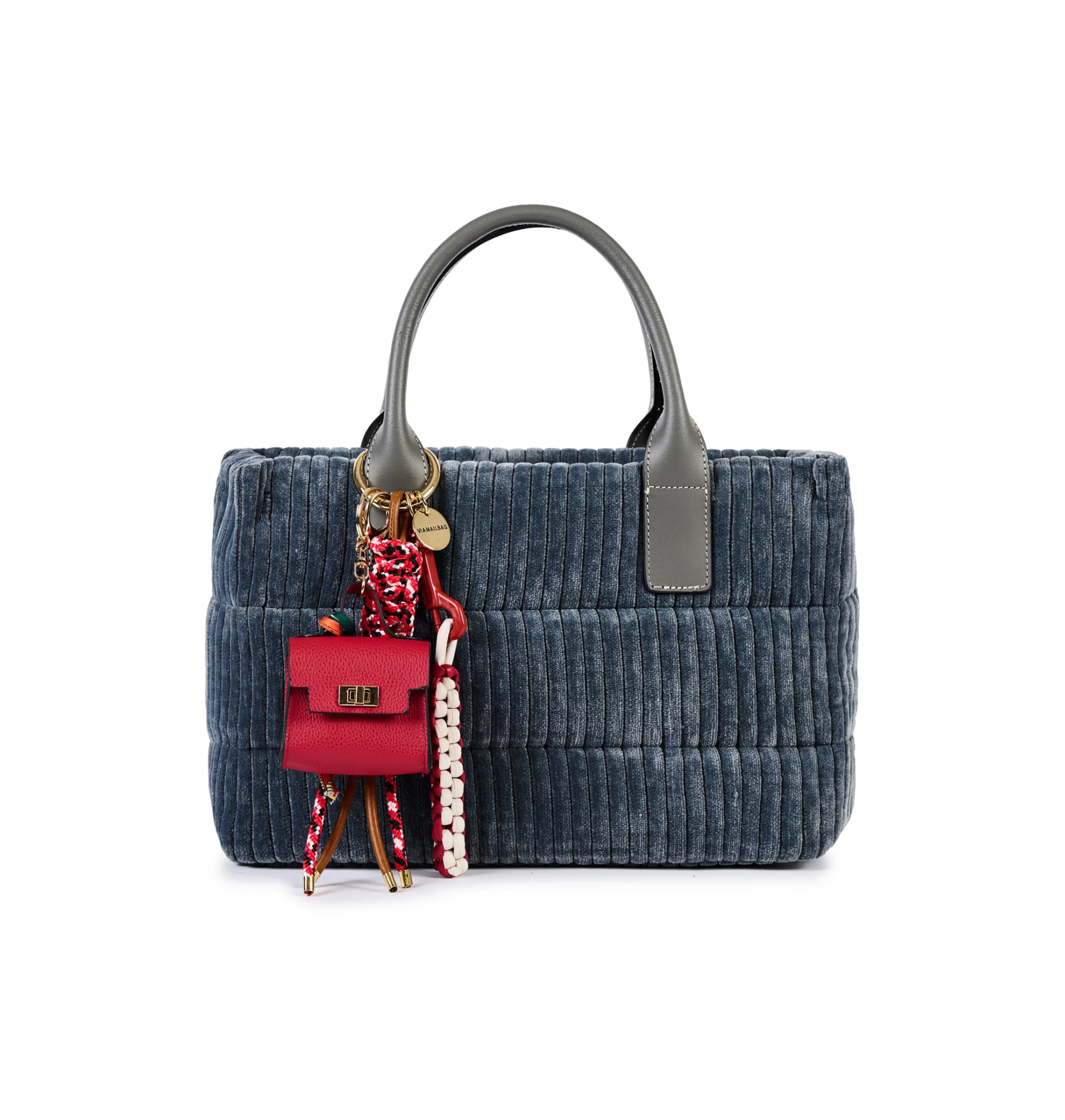 Borsa in velluto a coste con applicazione di charms, manico in pelle, chiusura con zip, tasca interna e tracolla in pelle.