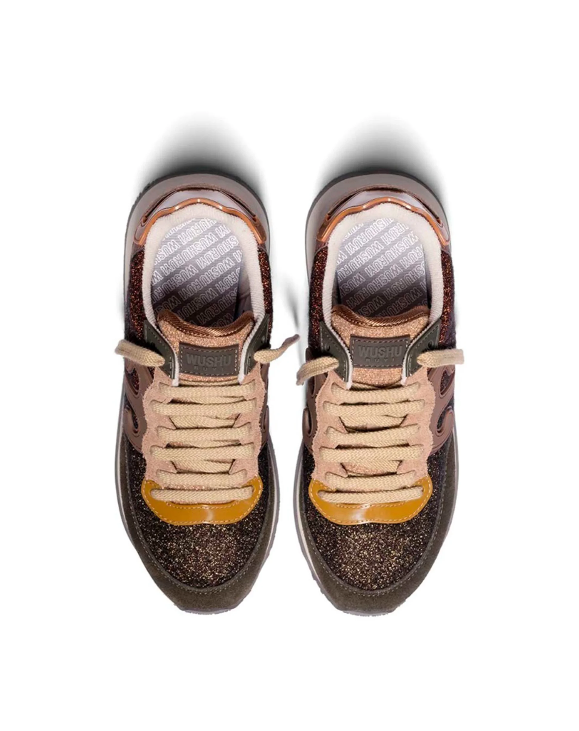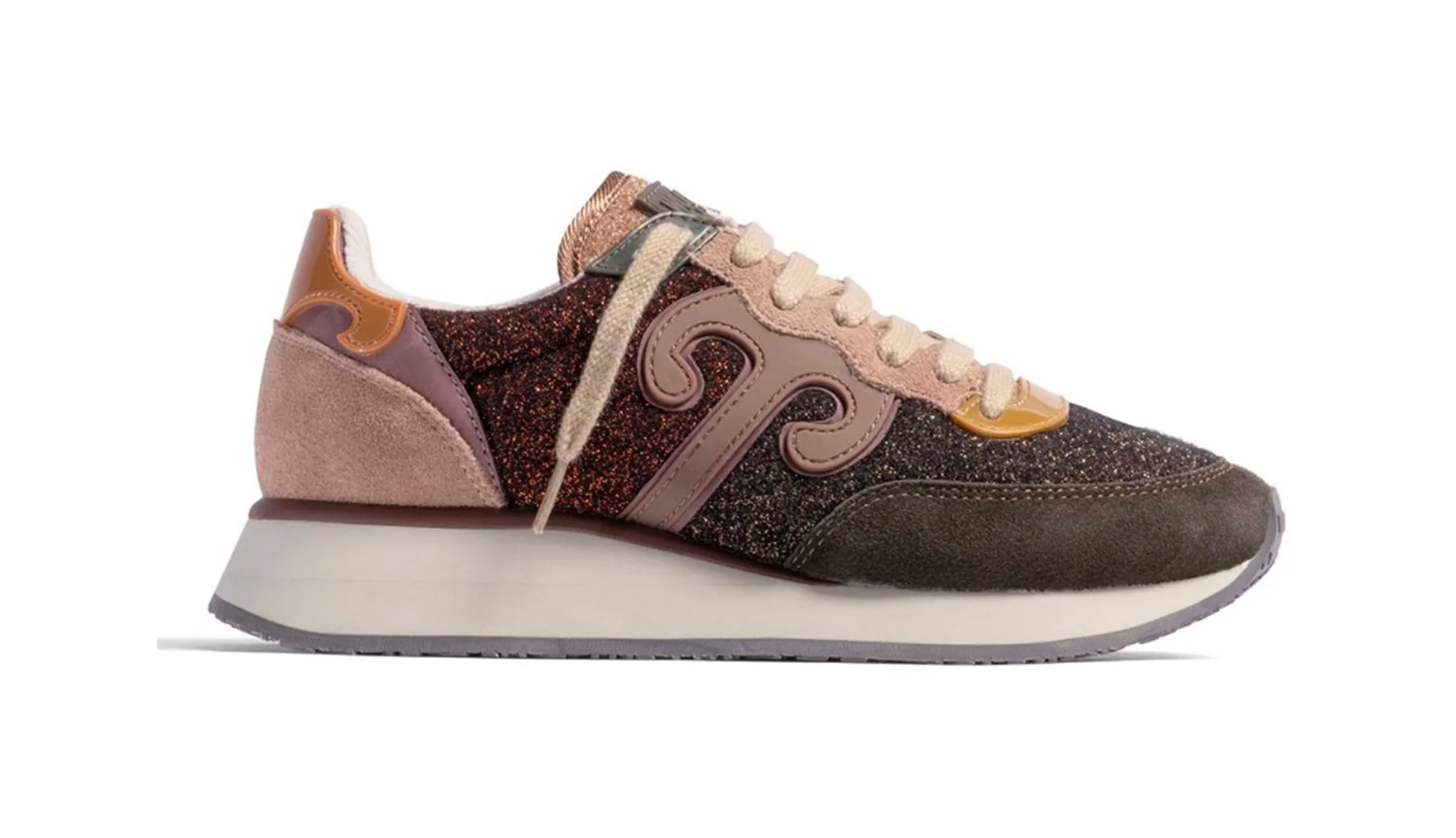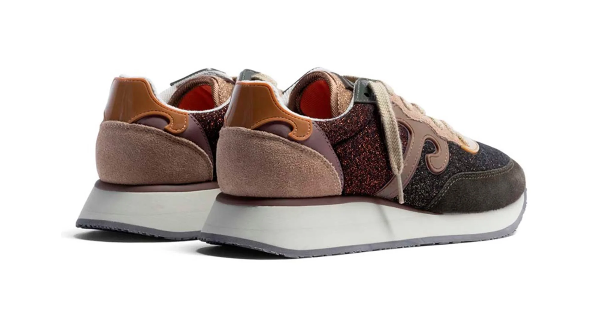 Camoscio color Delicioso e Affogat. Lana lurex color Mulch e Demitasse. Logo color Mountain Trail. Laccio color Gray Sand e secondo laccio color Delicioso.