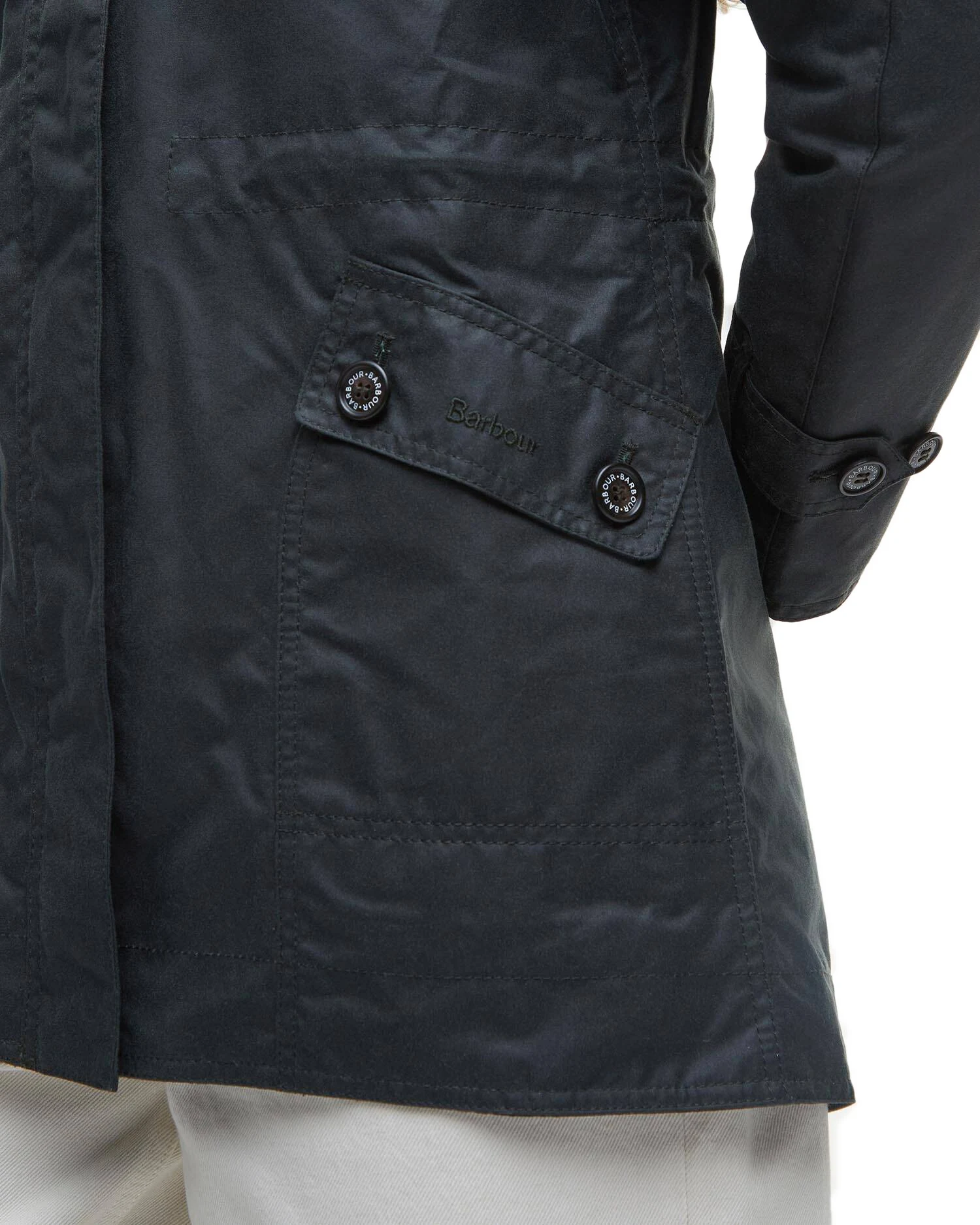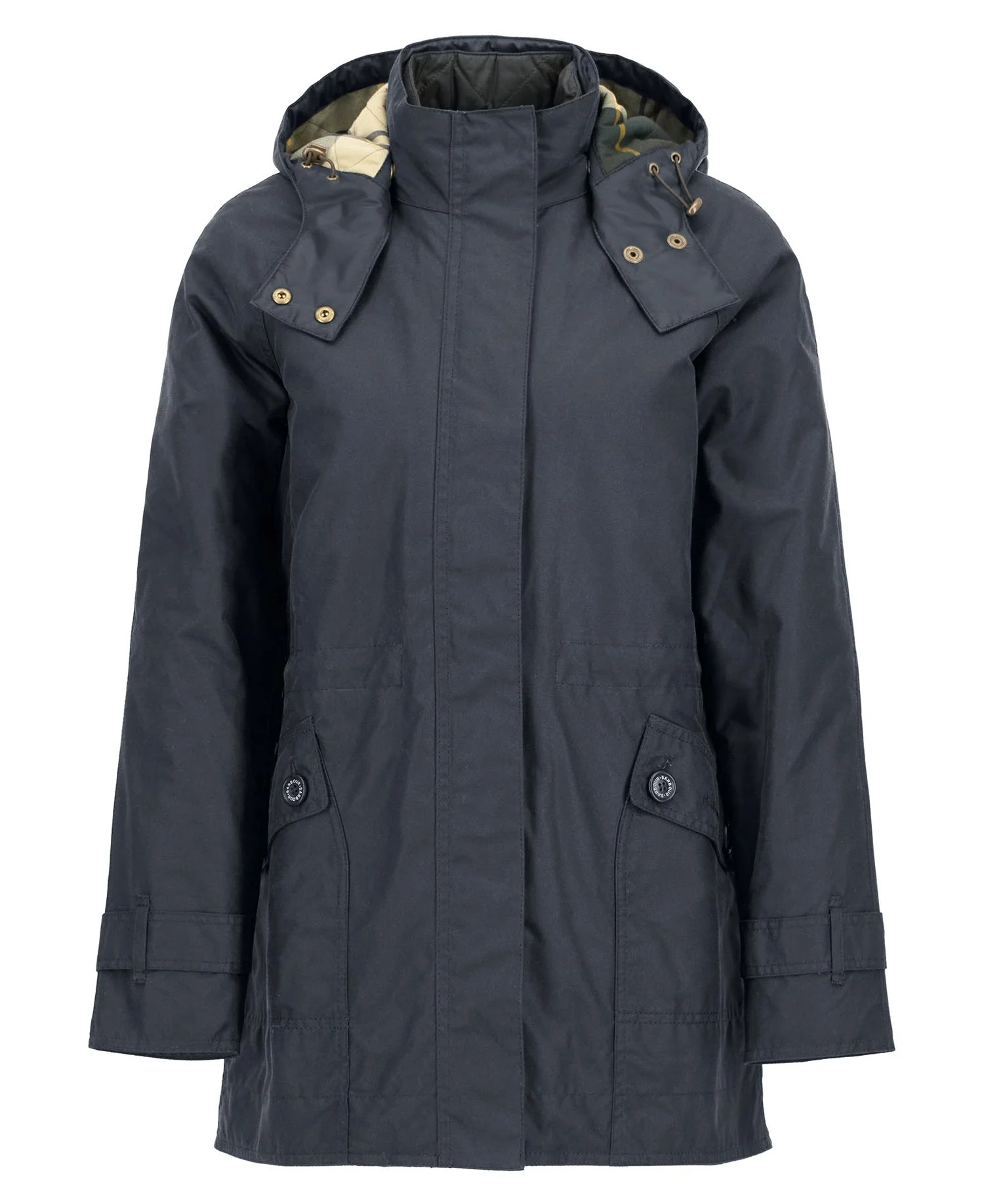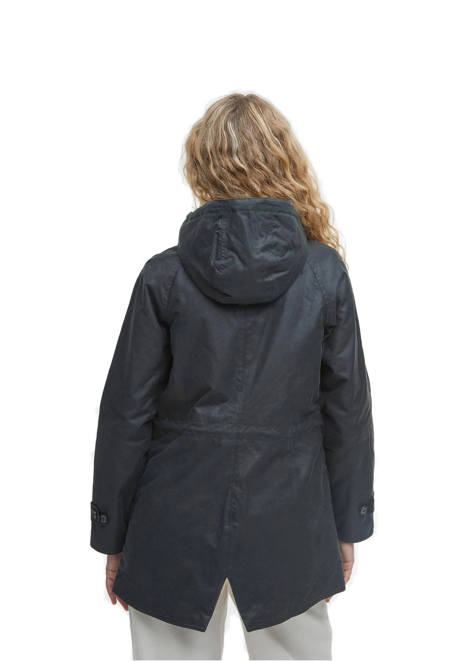 La giacca cerata Cannich di Barbour presenta uno stile ispirato al parka a coda di pesce di media lunghezza.