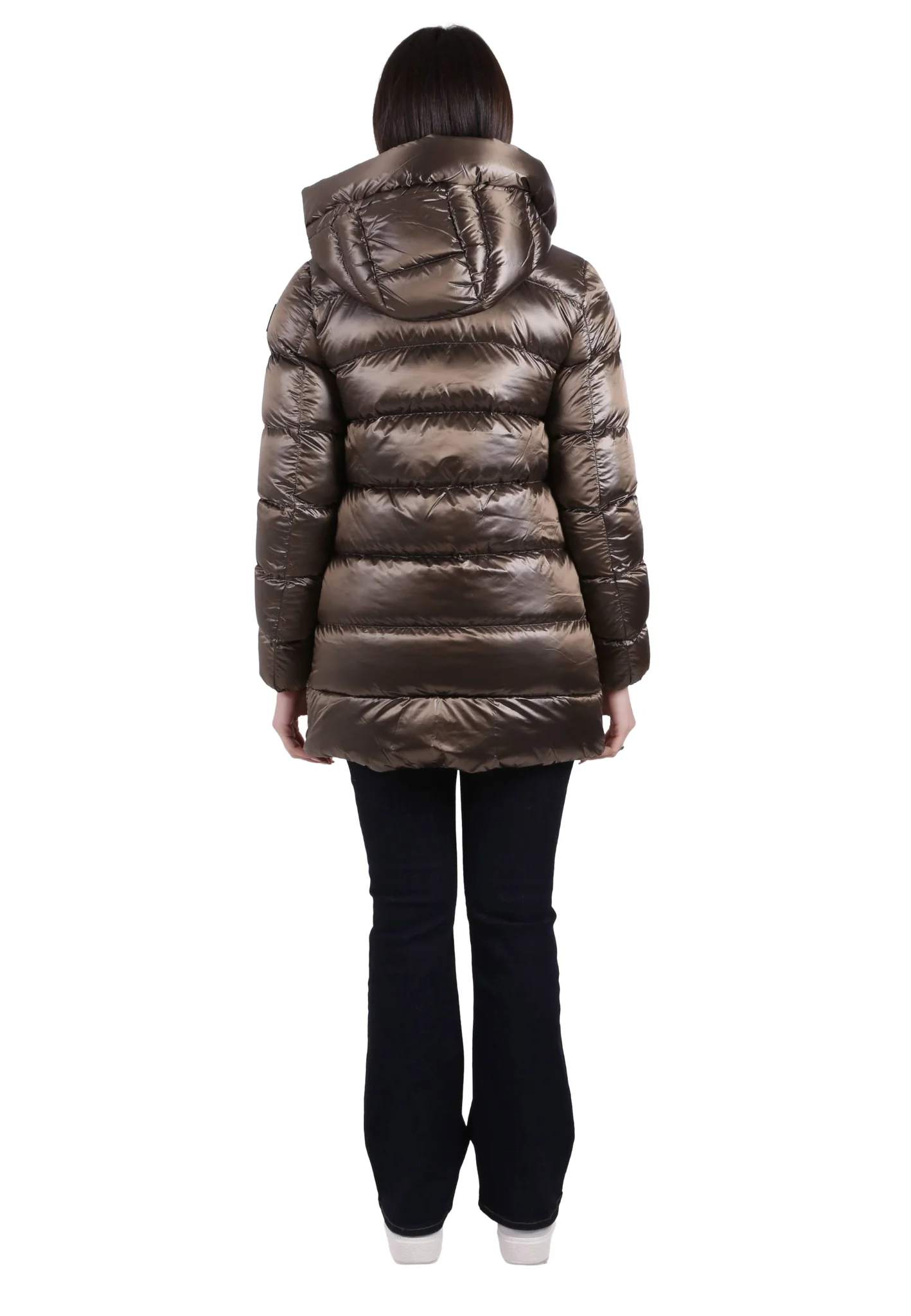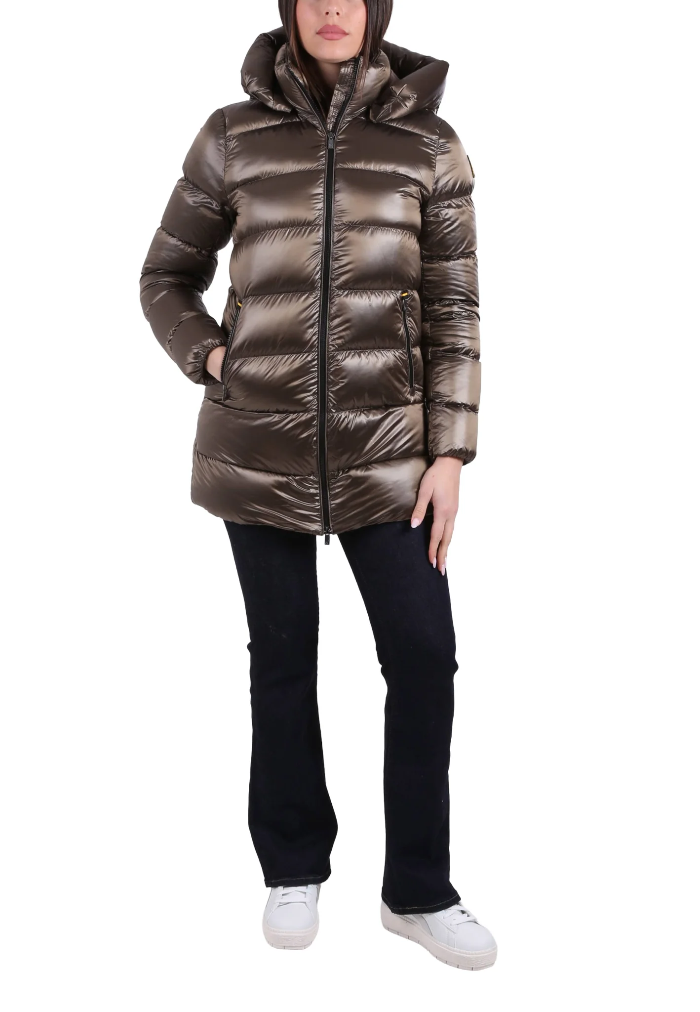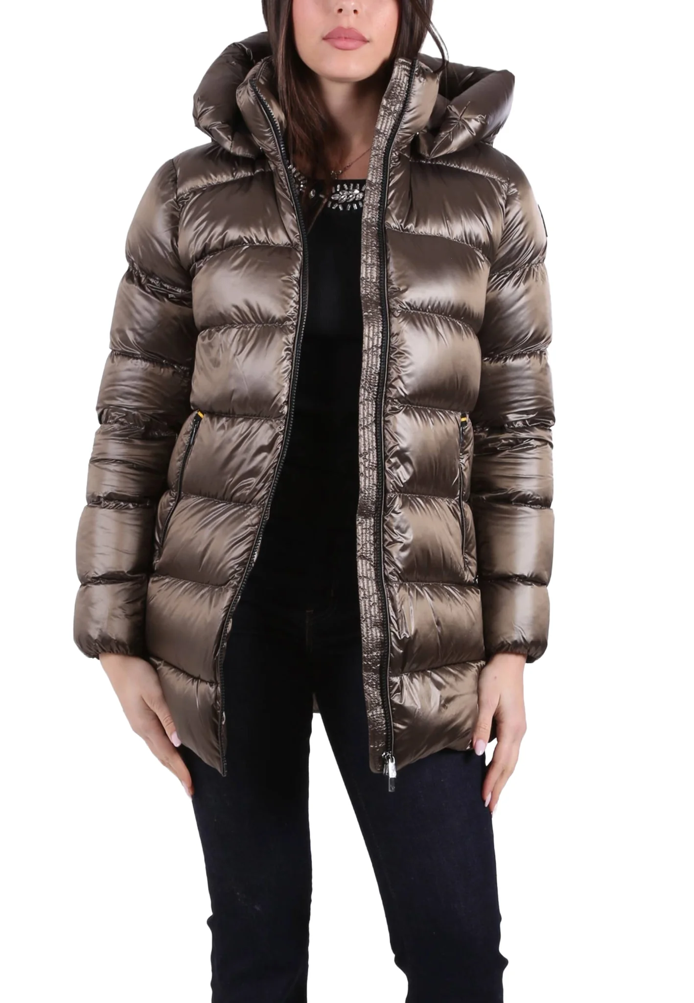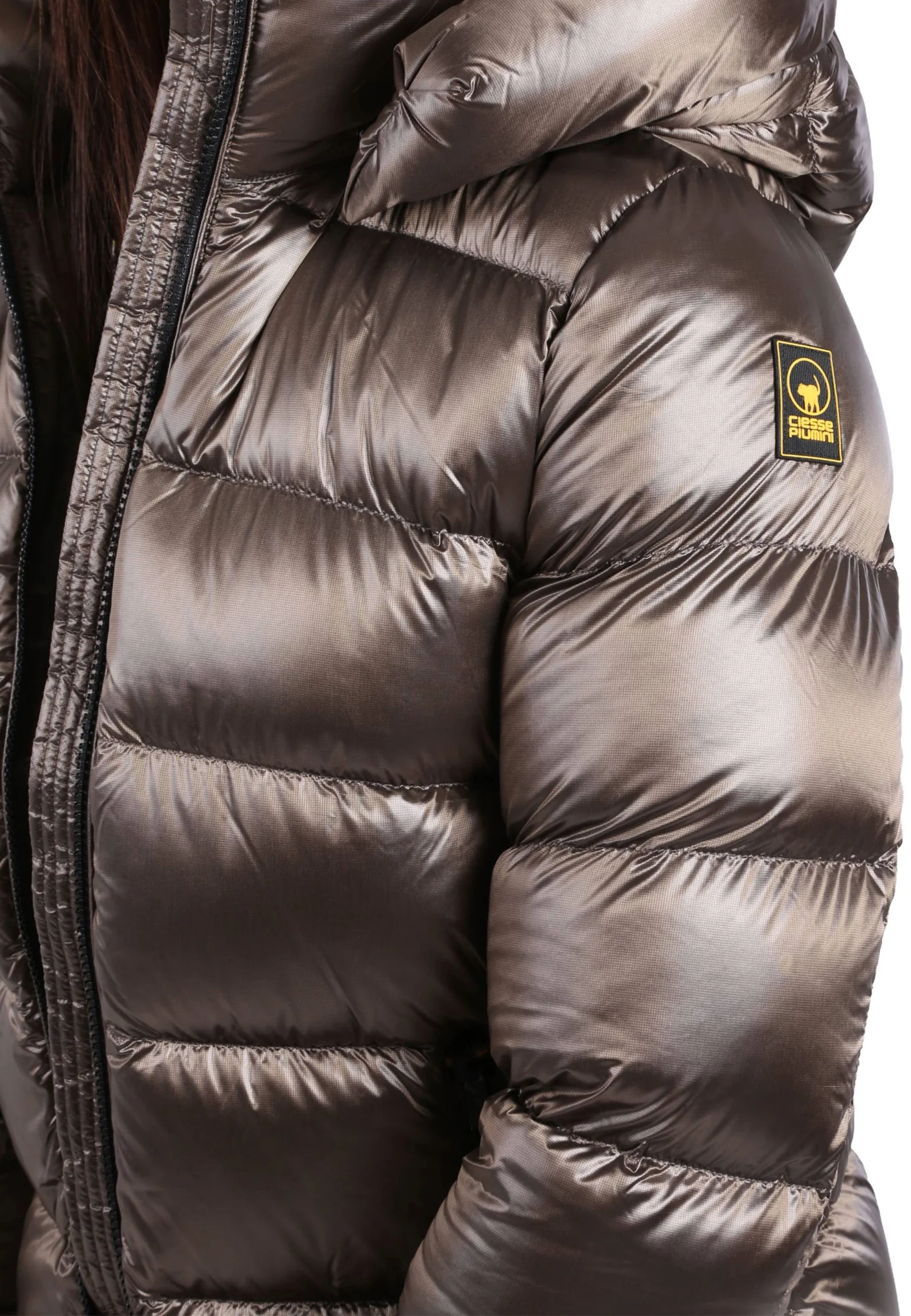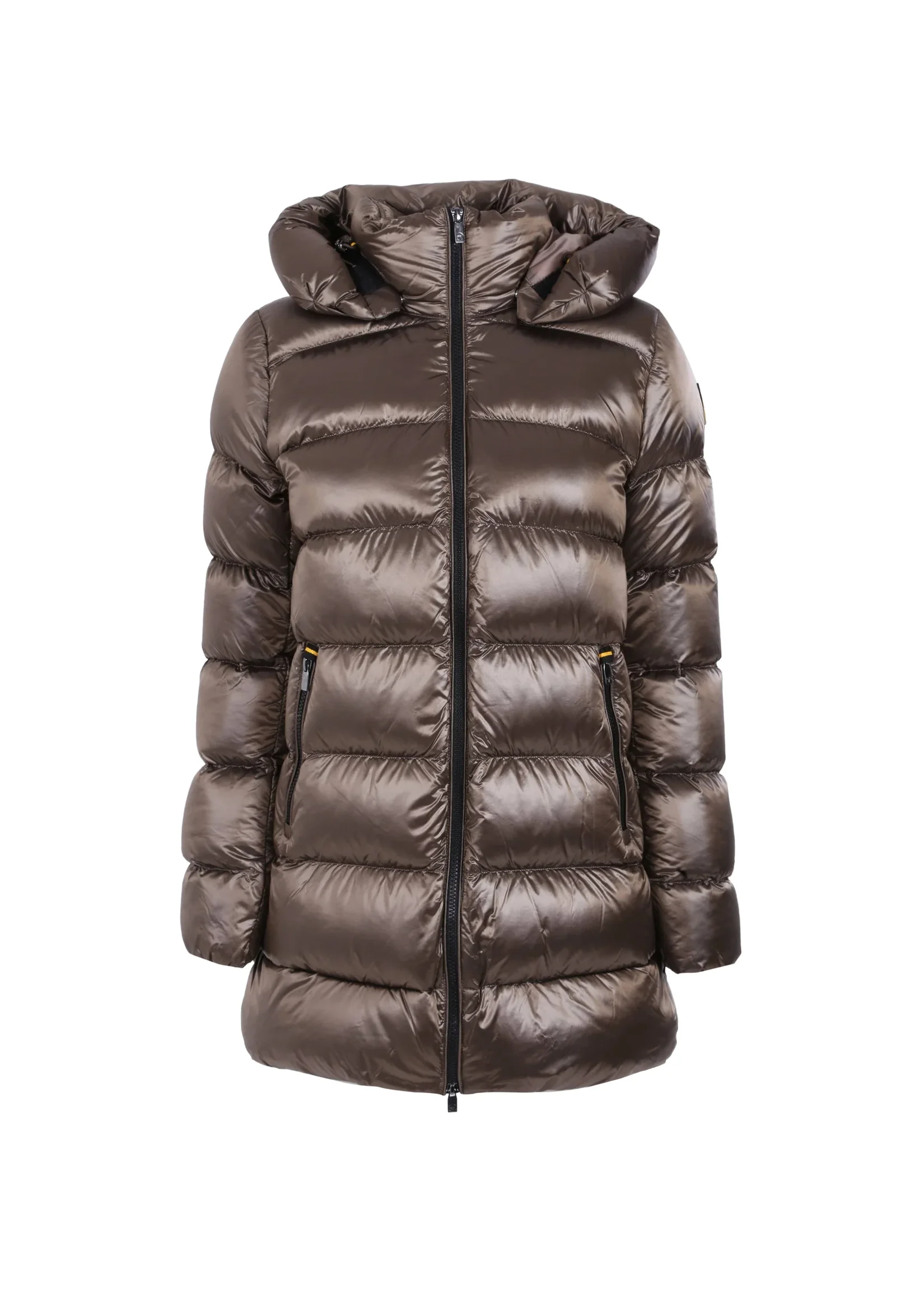Piumino medio-lungo beige 200 grammi da donna con cappuccio staccabile, realizzato in tessuto microripstop lucido a trama nera e imbottito con vera piuma certificata 800 fill power, che assicura elevate performance termiche e leggerezza assoluta.