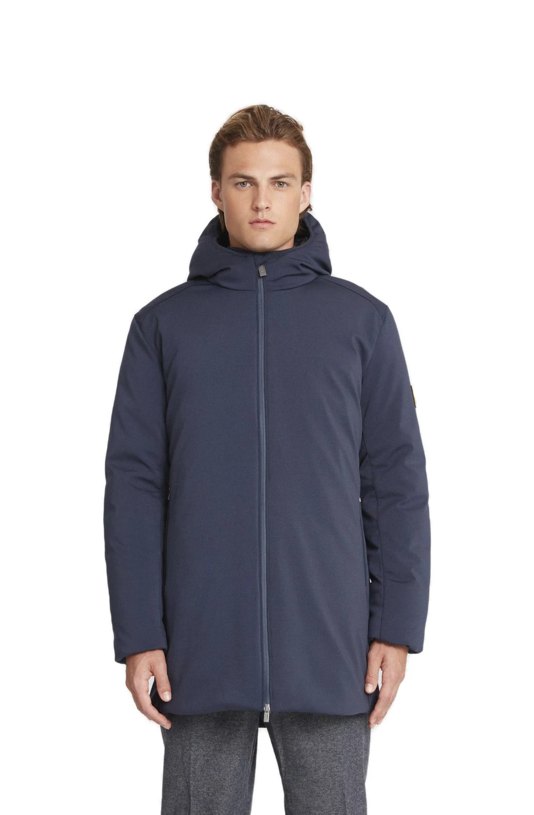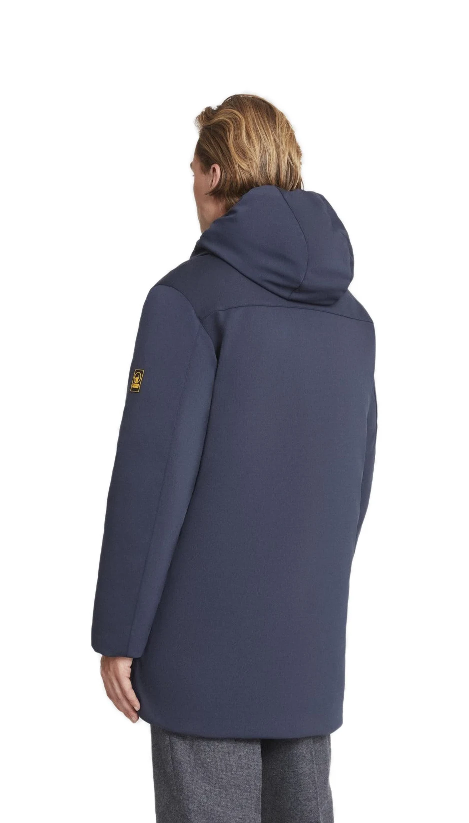 Giacca lunga blu in softshell da uomo, con cappuccio e imbottitura ecodown FELLEX® Thermar Pearl.