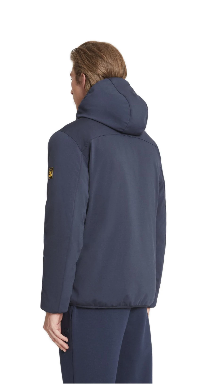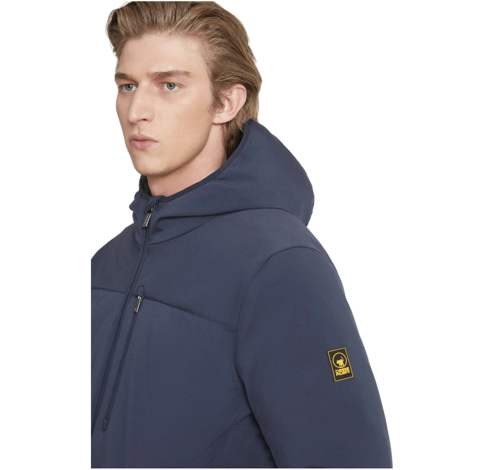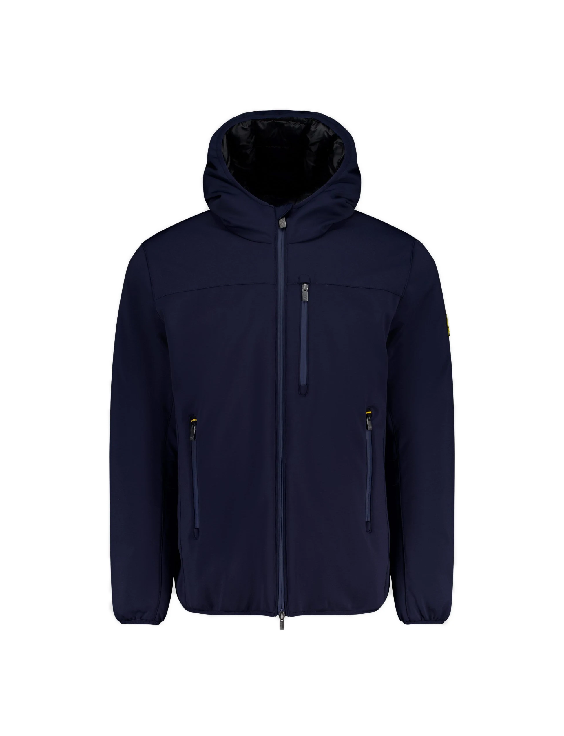 Giacca blu in softshell da uomo, con cappuccio e imbottitura ecodown FELLEX® Thermar Pearl, pensata per unire protezione e comfort in un look essenziale.