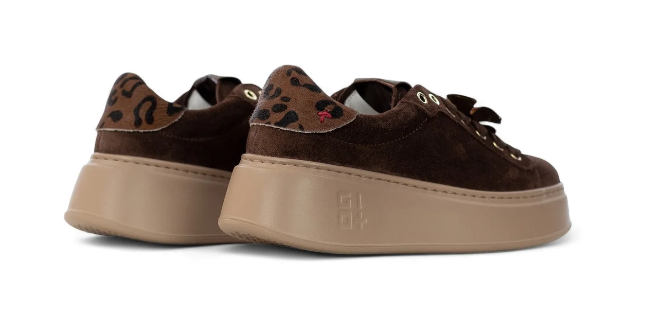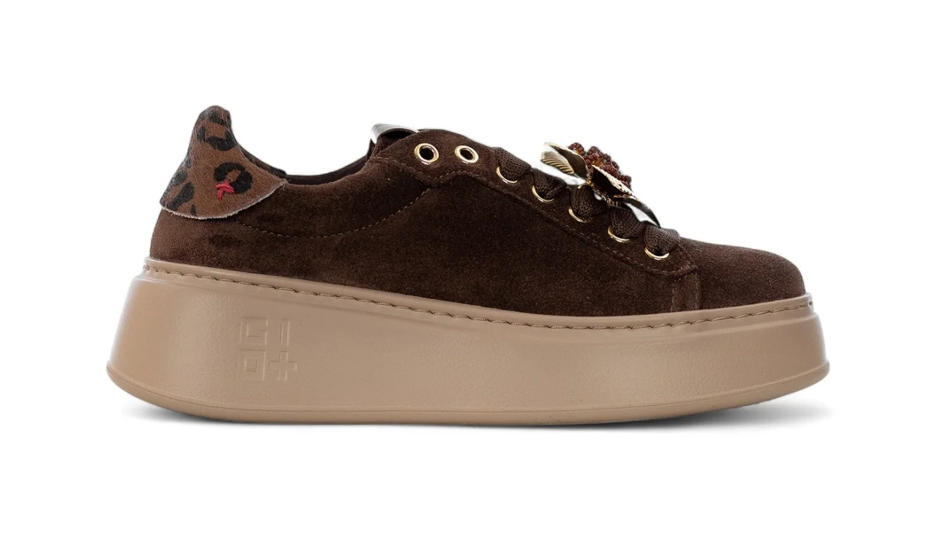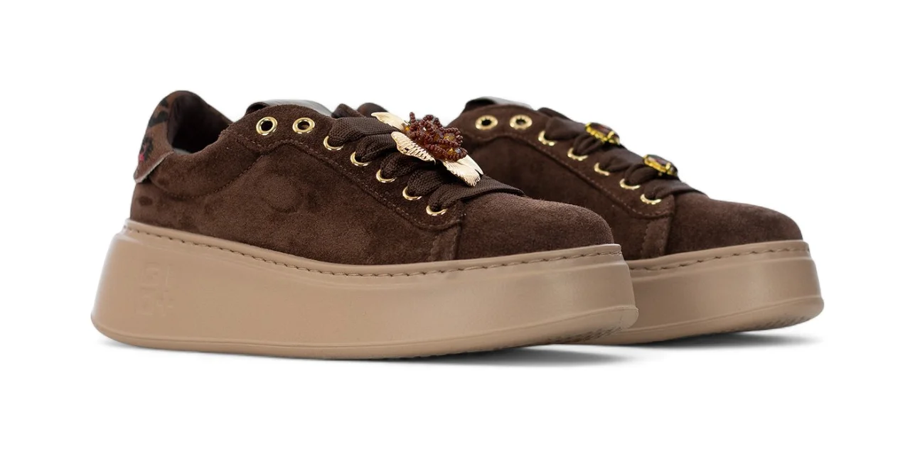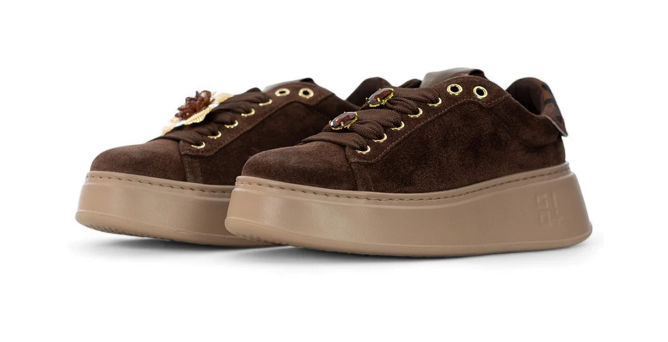 In camoscio di colore marrone . Caratterizzata da occhielli in metallo oro, targhetta sulla linguetta con il logo in laminato oro e sono applicati accessori passalaccio a forma di fiore e castoni, lacci piatti in cotone.