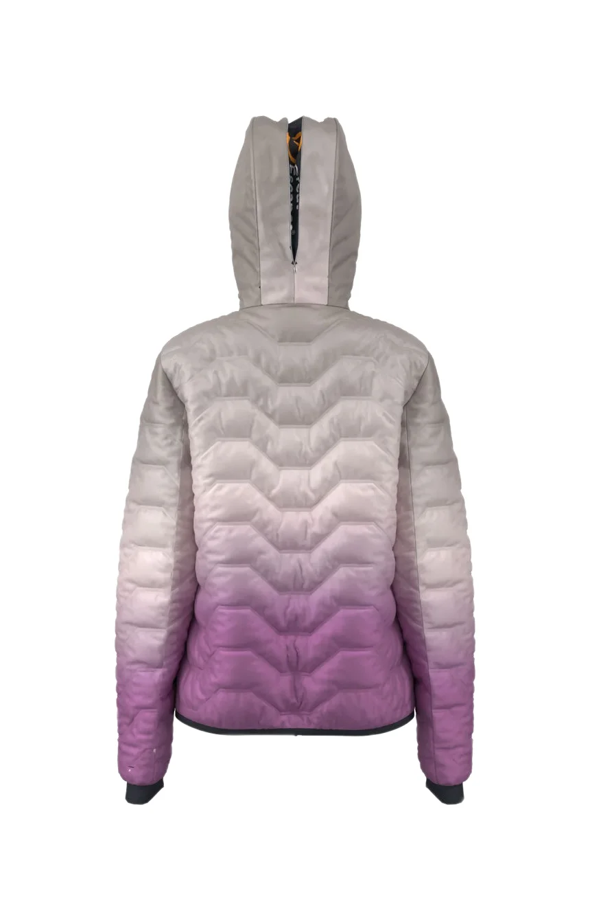 Giacca termica imbottita con cuciture a ultrasuoni. La particolare costruzione del capo rende la giacca molto leggera e calda, il cappuccio fisso è regolabile e allargabile tramite una zip. Due tasche in vita e un taschino interno porta skipass rendono la giacca ibrida sia per lo sci che per il tempo libero. Stampa sublimatica degradé.