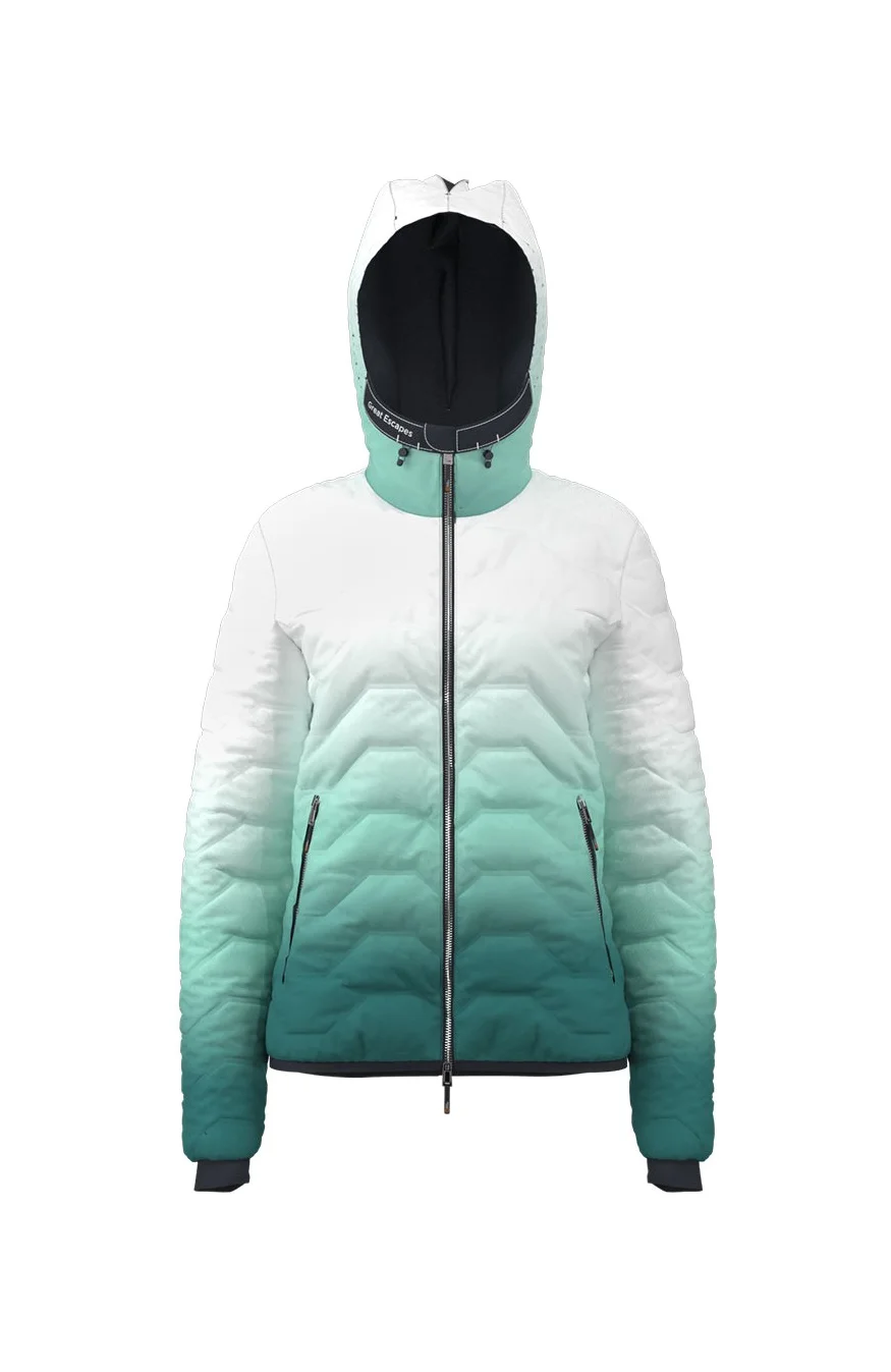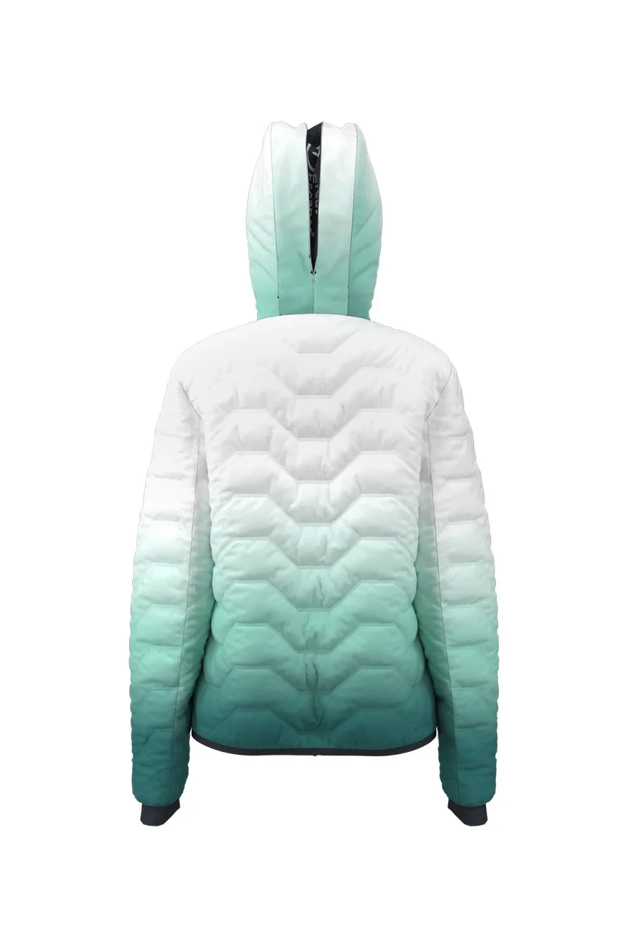 Giacca termica imbottita con cuciture a ultrasuoni. La particolare costruzione del capo rende la giacca molto leggera e calda, il cappuccio fisso è regolabile e allargabile tramite una zip. Due tasche in vita e un taschino interno porta skipass rendono la giacca ibrida sia per lo sci che per il tempo libero. Stampa sublimatica degradé.