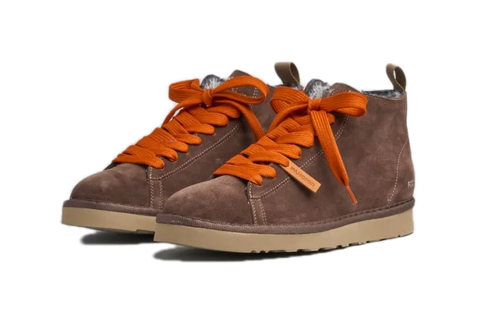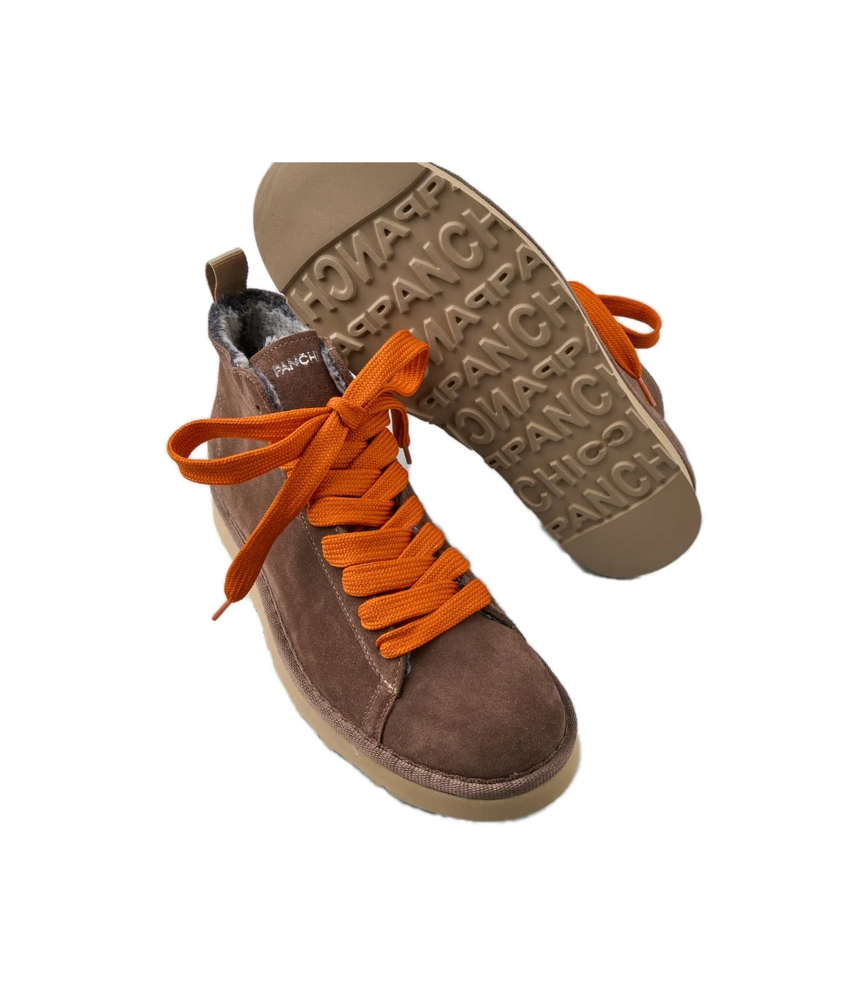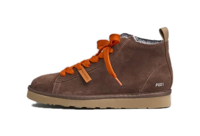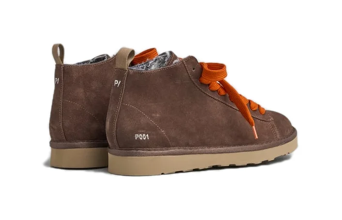 Polacchini uomo P001 con tomaia di camoscio marrone noce, lacci a trama larga verde oliva e fodera di faux-fur. La P01 con le sue linee pulite rappresenta il perfetto equilibrio fra design e comfort.
