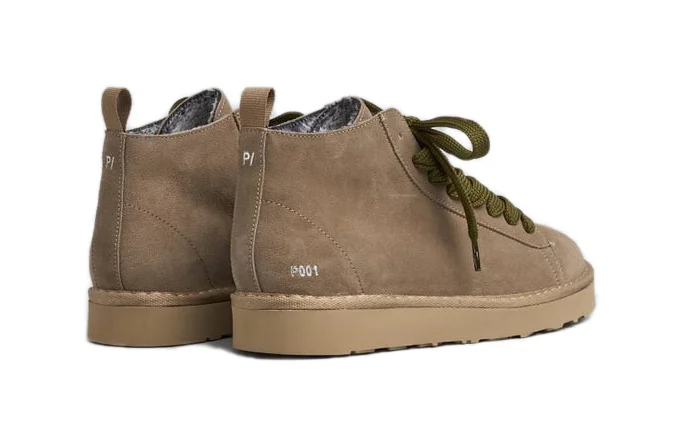 Polacchini uomo P001 con tomaia di camoscio marrone noce, lacci a trama larga verde oliva e fodera di faux-fur. La P01 con le sue linee pulite rappresenta il perfetto equilibrio fra design e comfort.